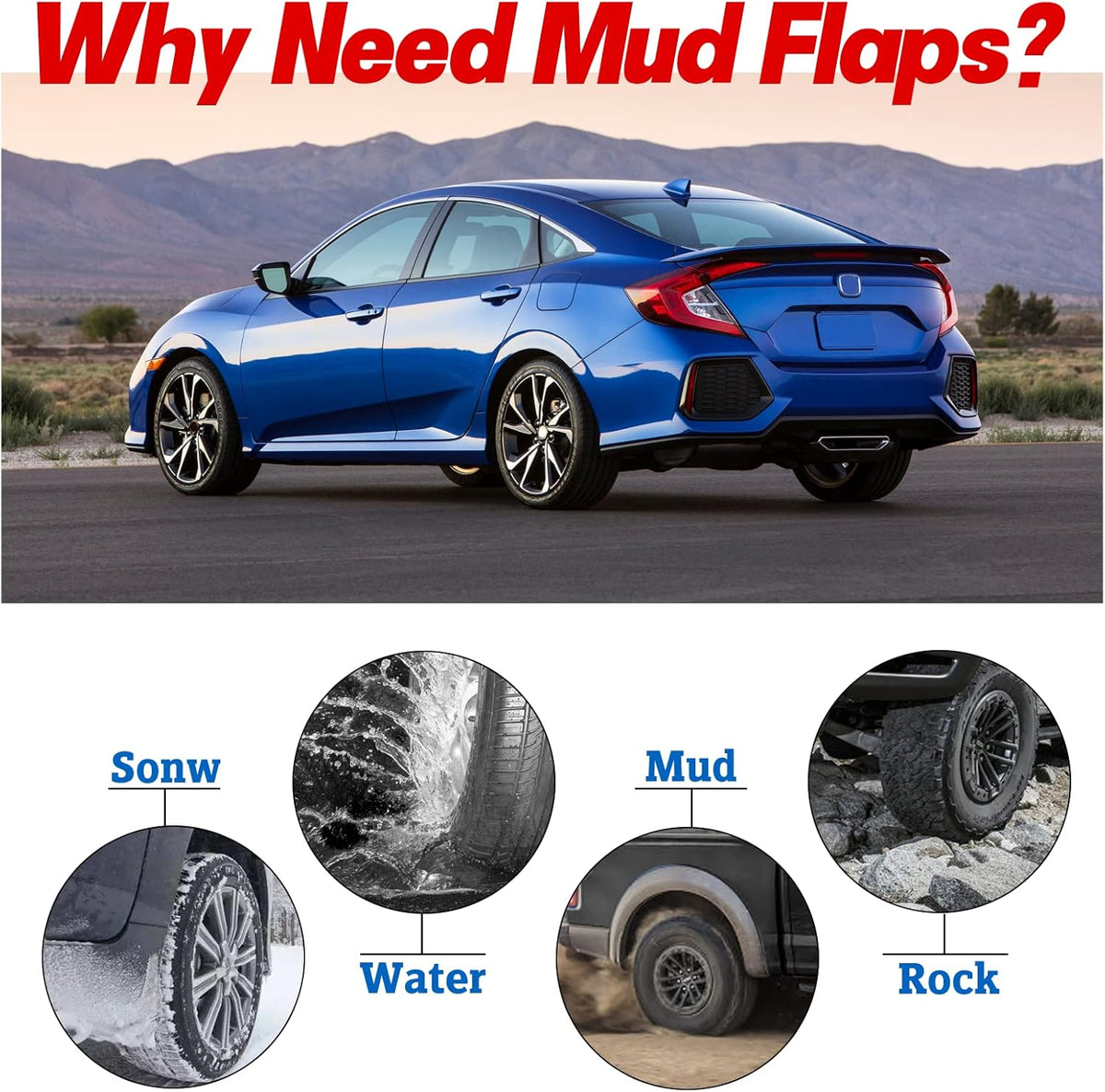 【Strong Material】Mud guards made of top-quality PP(Polypropylene)+TPO(Thermoplastic polyolefin)materials, after rigorous tests ensure that the mud flaps for honda civic can work, such as low temperatures, rainy days, and snow day or dry. Protecting your car is easy to clean and reduces dirt.