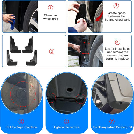 【Easy Installation】Fender flares for your car are fast and simple to install & remove. No drill is required, without wheel, or tire removal. There are holes in the fender, easy to install, and saves you time. A bag of fixings screws you need is included, just install them in the original hole position, and the splash guard will stay in place after the installation, perfectly matching your car model.