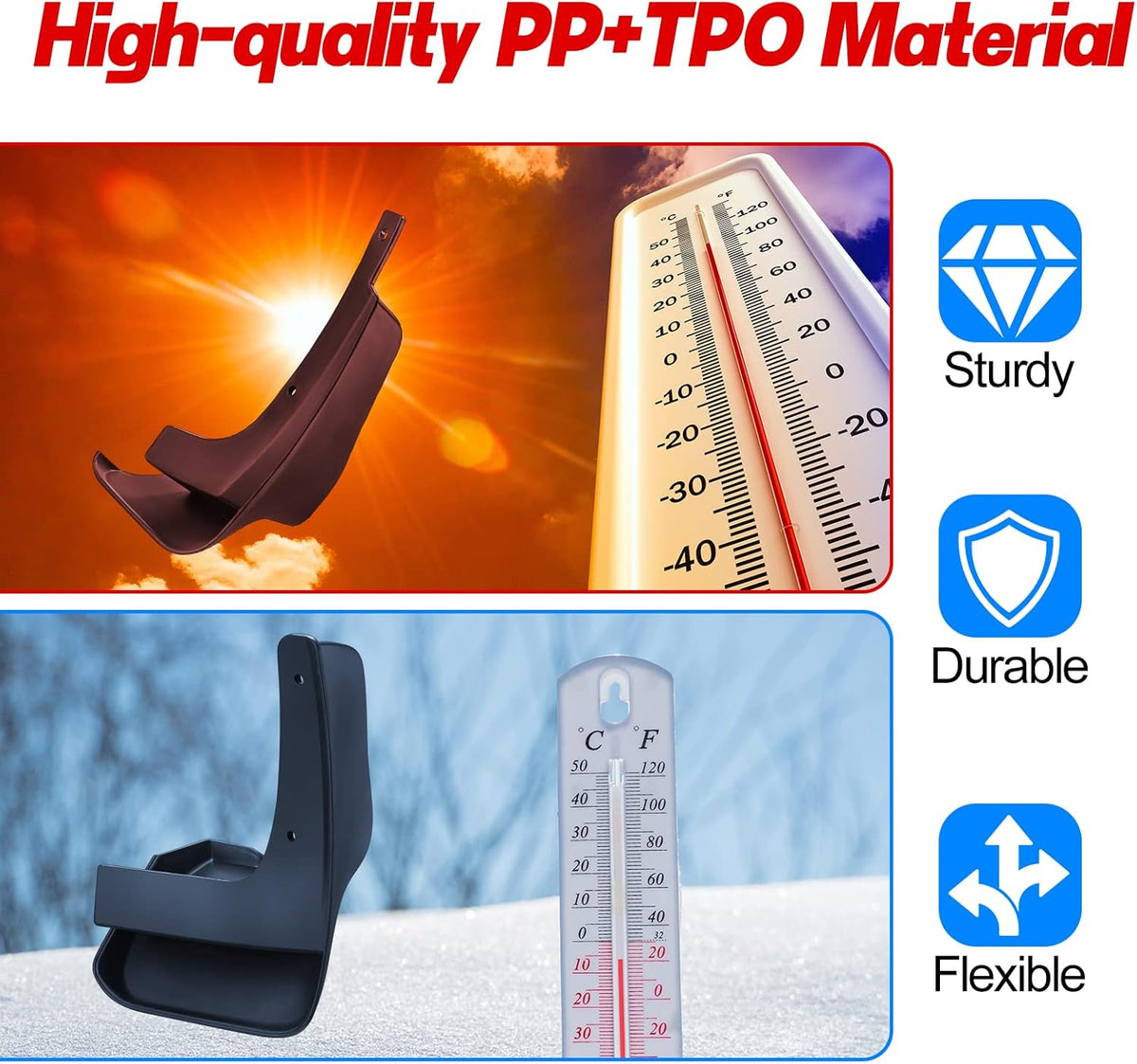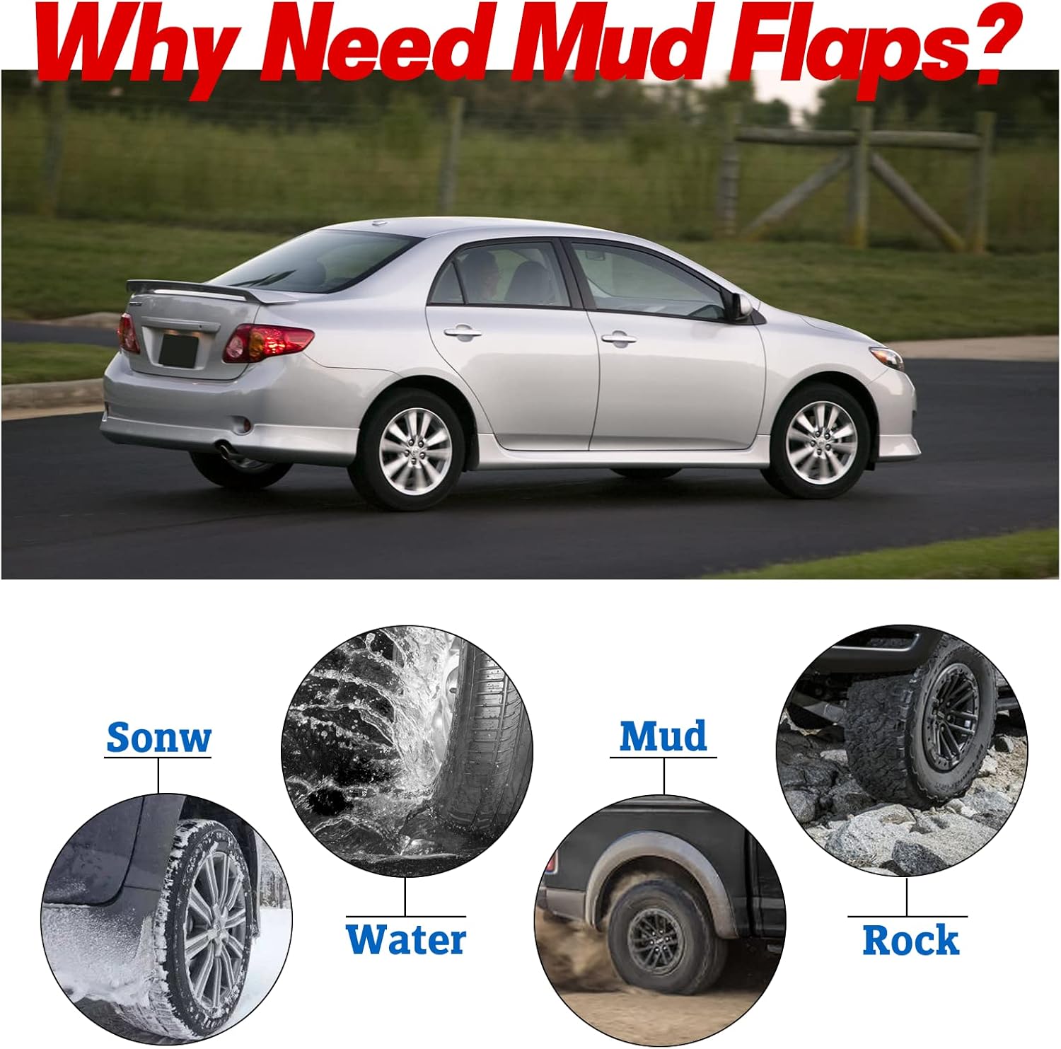 【Strong Material】Mud guards made of top-quality PP(Polypropylene)+TPO(Thermoplastic polyolefin)materials, after rigorous tests ensure that the mud flaps for Toyota corolla can work, such as low temperatures, rainy days, and snow day or dry. Protecting your car is easy to clean and reduces dirt.