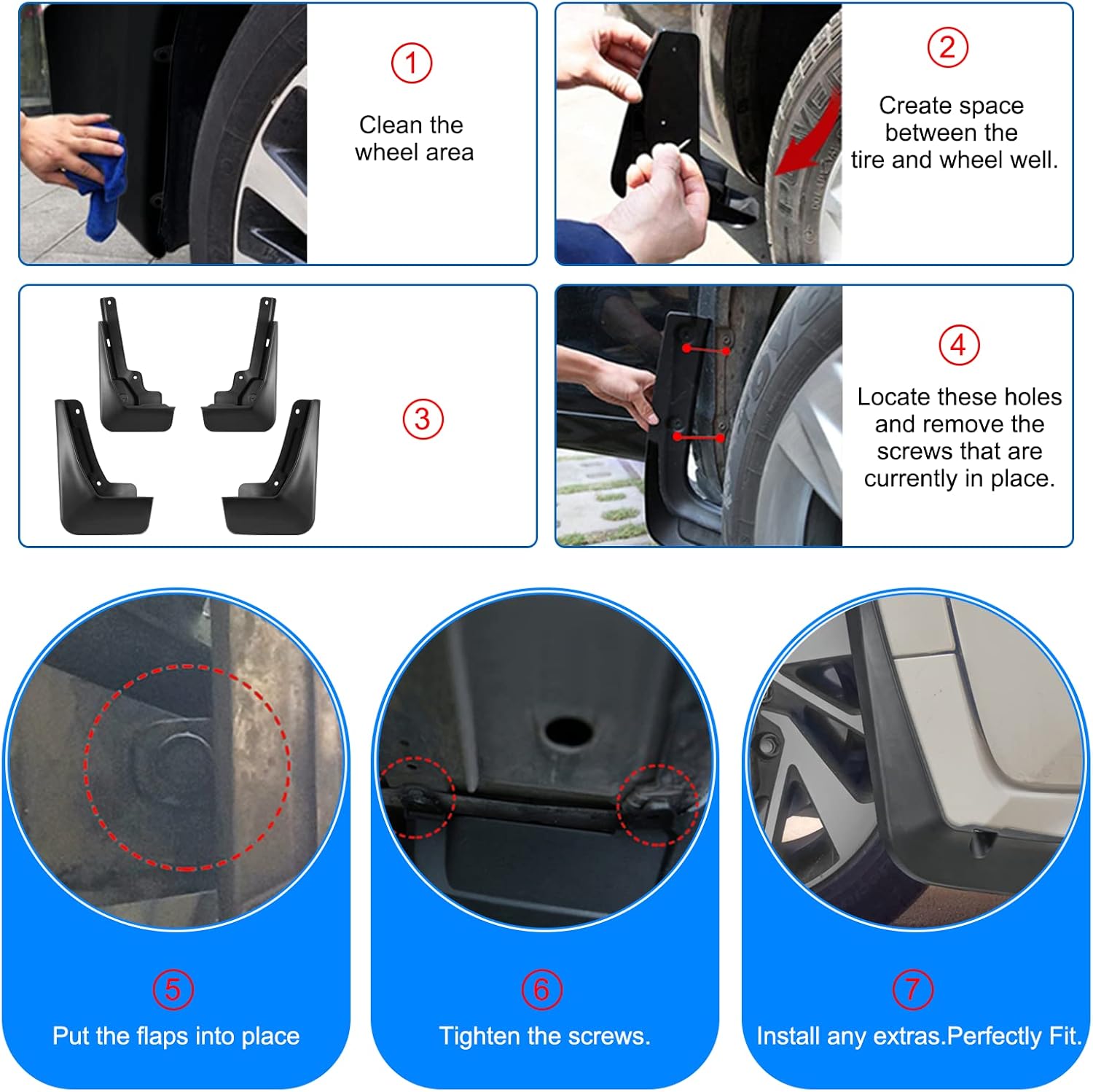 【Easy Installation】Fender flares for your car are fast and simple to install & remove.No drill is required, without wheel, or tire removal. There are holes in the fender, easy to install, and saves you time. A bag of fixings screws you need is included, just install them in the original hole position, and the splash guard will stay in place after the installation, perfectly matching your car model.