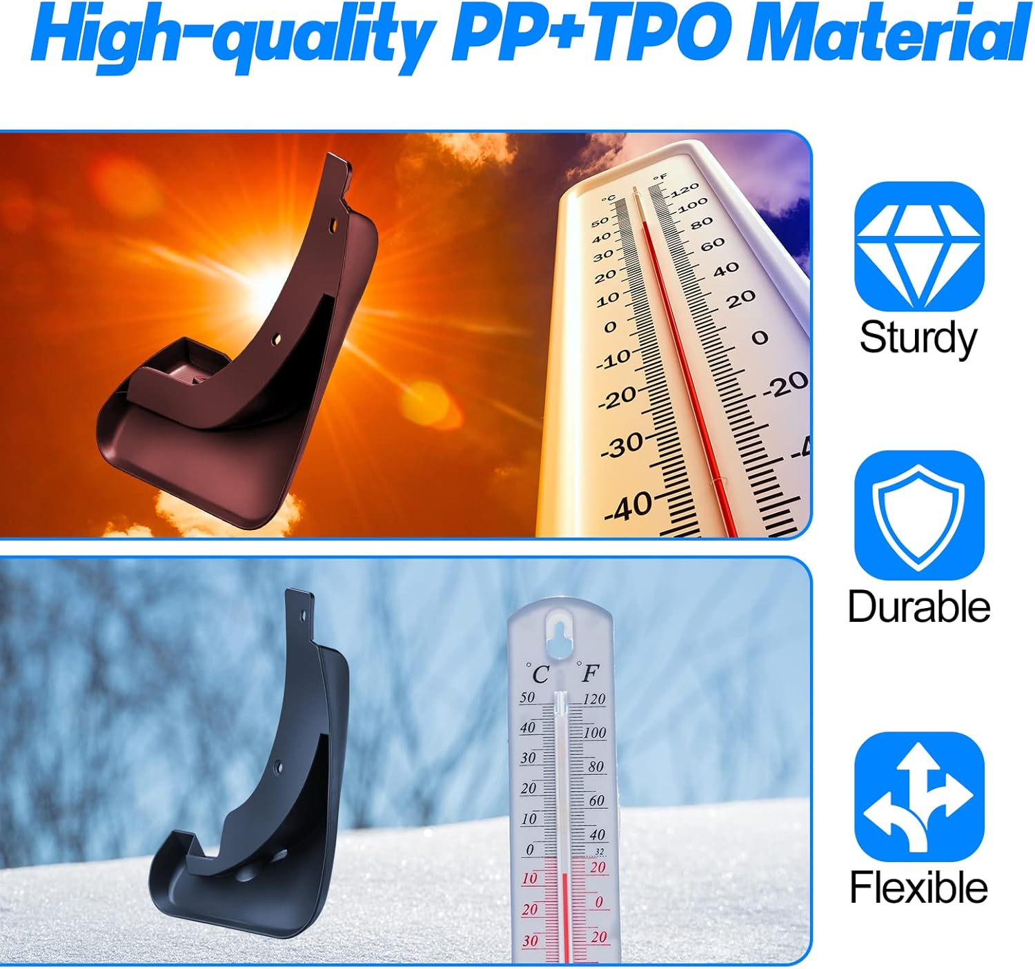 【Srong Material】Mud guards made of top-quality PP(Polypropylene)+TPO(Thermoplastic polyolefin)materials, after rigorous tests ensure that the mud flaps for Toyota corolla can work, such as low temperatures, rainy days, and snow day or dry. Protecting your car is easy to clean and reduces dirt.