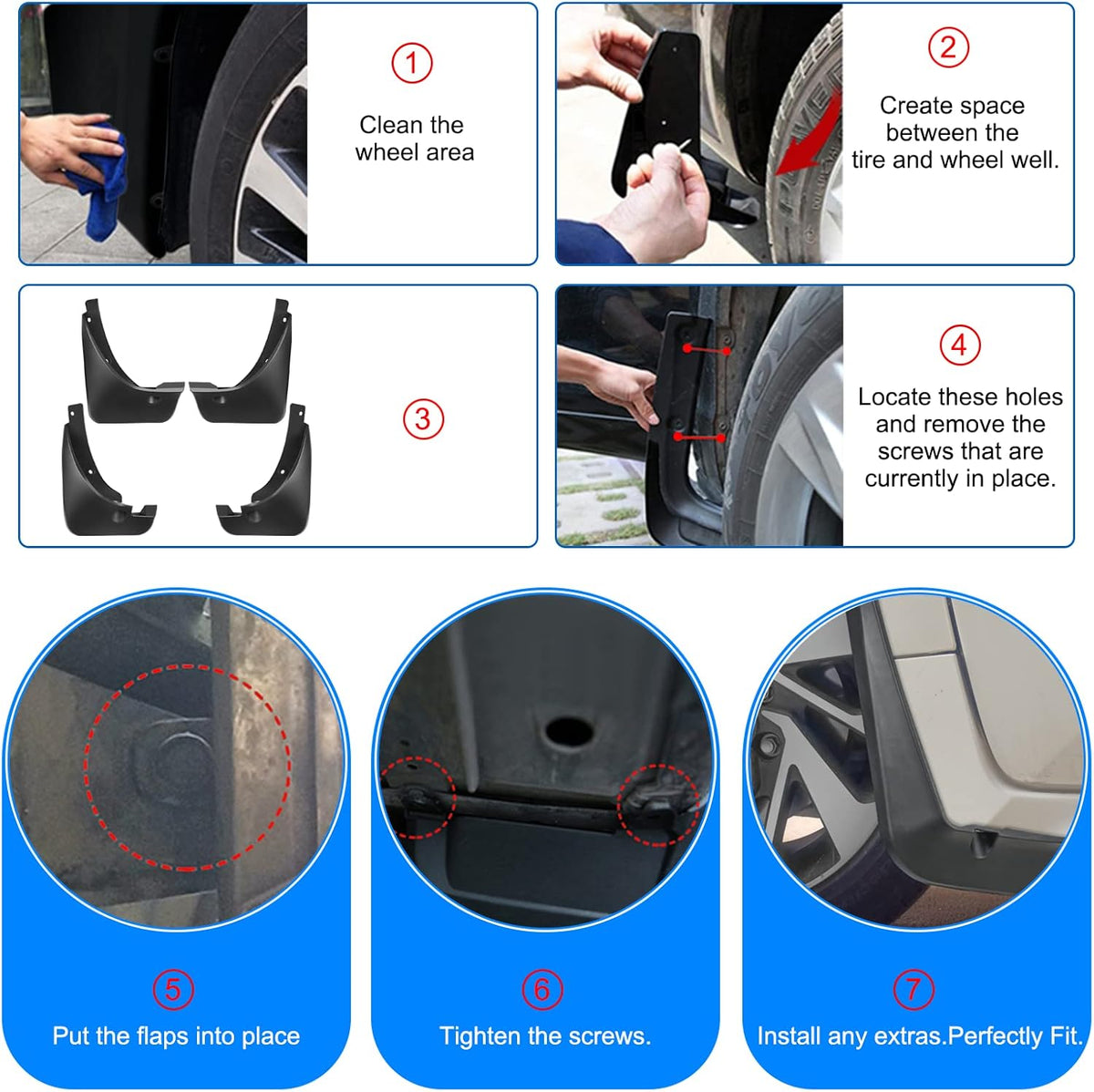 【Easy Installation】Fender flares for your car are fast and simple to install & remove. No drill is required, without wheel, or tire removal. There are holes in the fender, easy to install, and saves you time. A bag of fixings screws you need is included, just install them in the original hole position, and the splash guard will stay in place after the installation, perfectly matching your car model.