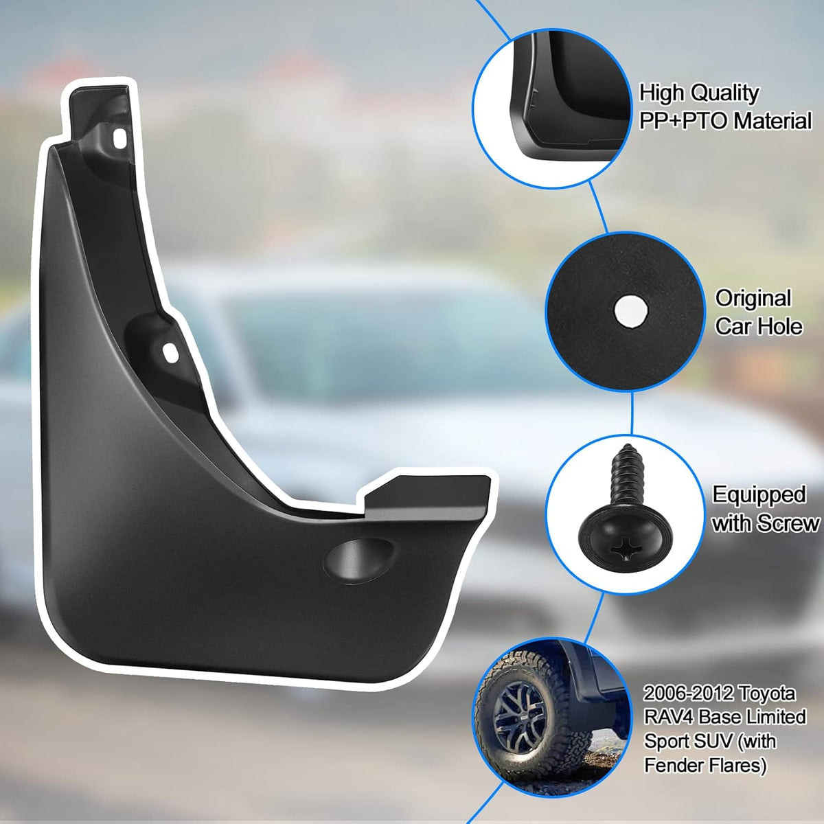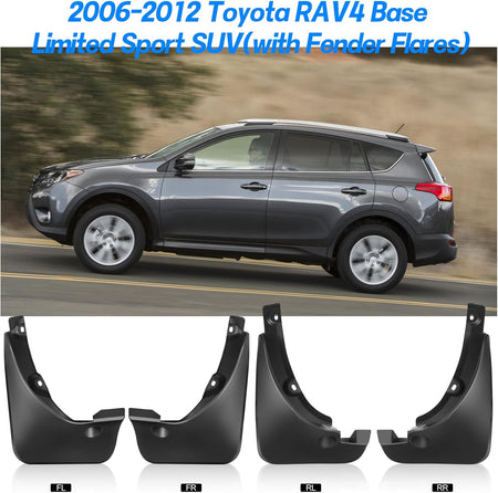 Prefect Designed: Mud flaps conforms to the car body design and protects the car body clean compatible with Toyota RAV4 2007-2012 base / limited / sport sport utility 4-door; RAV4 2012 EV sport utility 4-door. Please Note: Fit with OEM fender flares and OEM chassis;Not Fit 2006 “T180” models and wheel base model , Not Compatible with side skirts (Ground kits) or body modifications
