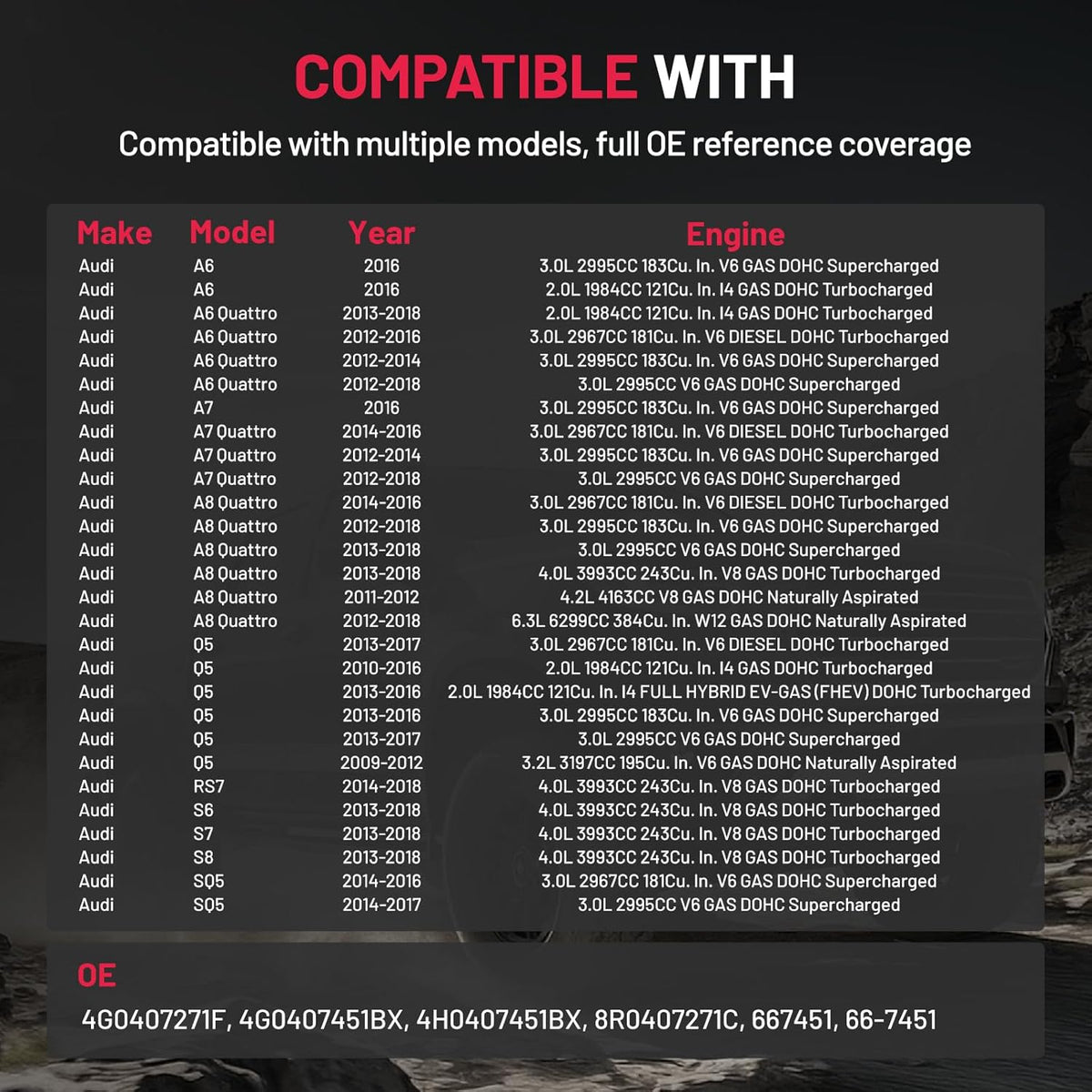 【Compatible Vehicles】 Compatible with Audi A6 2016; Compatible with Audi A6 Quattro 2012-2018; Compatible with Audi A7 2016; Compatible with Audi A7 Quattro 2012-2018; Compatible with Audi A8 Quattro 2011-2018; Compatible with Audi Q5 2009-2017; Compatible with Audi RS7 2014-2018; Compatible with Audi S6 2013-2018; Compatible with Audi S7 2013-2018; Compatible with Audi S8 2013-2018; Compatible with Audi SQ5 2014-2017