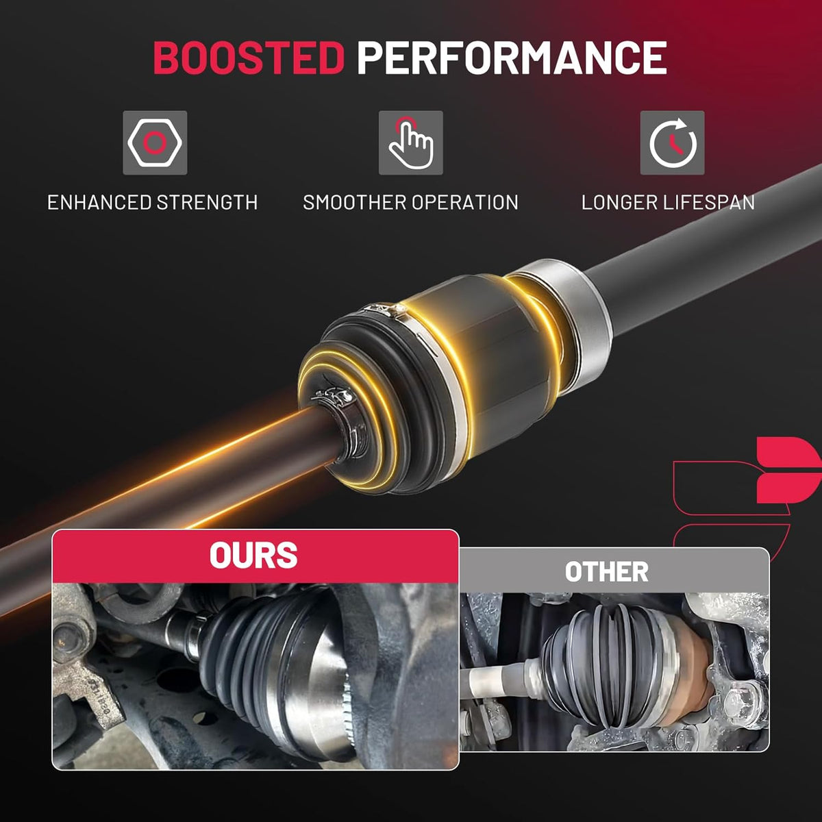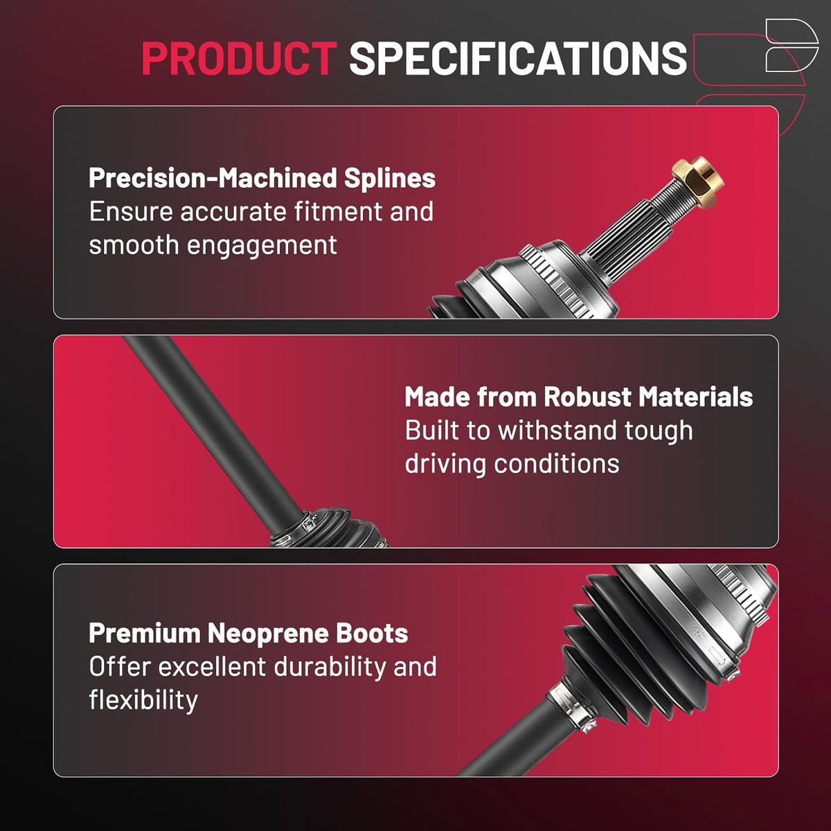 【Product Advantages】 Engineered for peak performance, our premium neoprene boots shield your CV joints from dirt and debris, while moly grease ensures smooth operation even under extreme temperatures. Secured with heavy-duty stainless-steel clamps, this durable, maintenance-free assembly delivers long-lasting reliability you can trust.