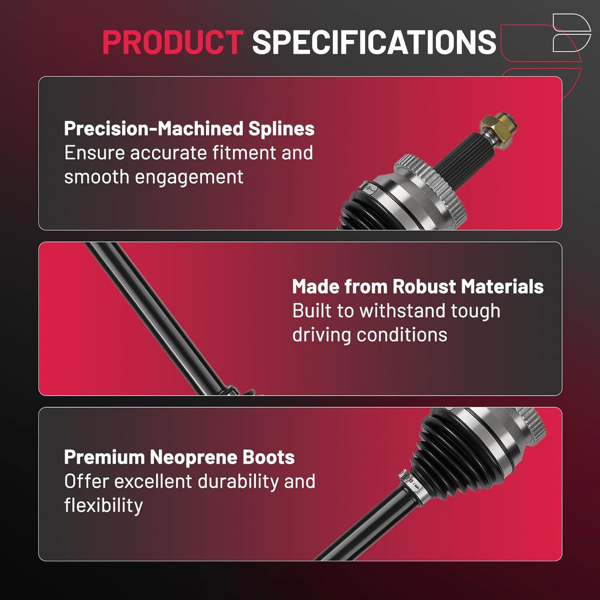 【Product Advantages】 Engineered for peak performance, our premium neoprene boots shield your CV joints from dirt and debris, while moly grease ensures smooth operation even under extreme temperatures. Secured with heavy-duty stainless-steel clamps, this durable, maintenance-free assembly delivers long-lasting reliability you can trust.