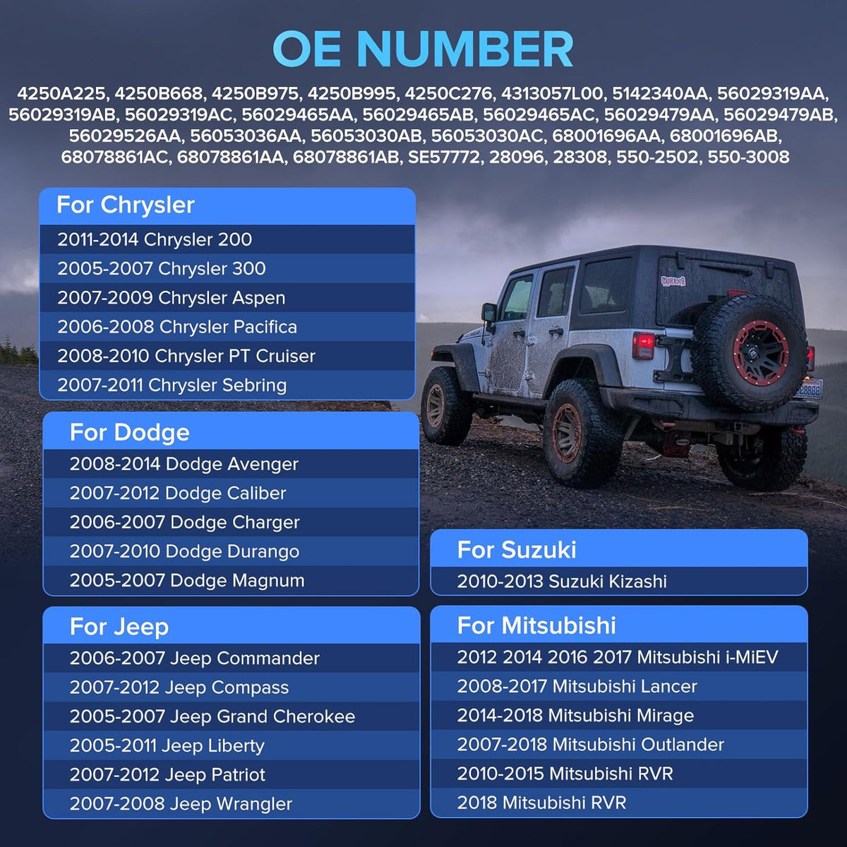 【 】- Tire Pressure Monitoring Systems (TPMS) Replacement Sensors OE 4250A225, 4250B668, 4250B975, 4250B995, 4250C276, 4313057L00, 5142340AA, 56029319AA, 56029319AB, 56029319AC, 56029465AA, 56029465AB, 56029465AC, 56029479AA, 56029479AB, 56029526AA, 56053036AA, 56053030AB, 56053030AC, 68001696AA, 68001696AB, 68078861AC, 68078861AA, 68078861AB, SE57772, 28096, 28308, 550-2502, 550-3008