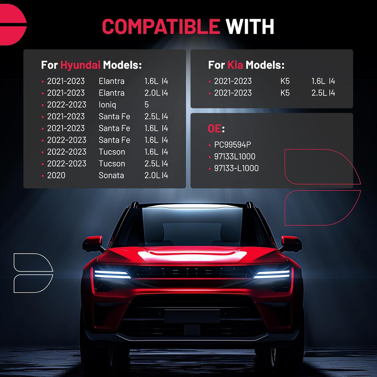 【Compatible Replacement】Compatible with Hyundai Models: 2021-2023 Elantra 1.6L l4, 2021-2023 Elantra 2.0L l4, 2021-2023 Elantra 1.6L l4, 2022-2023 Ioniq 5, 2021-2023 Santa Fe 2.5L l4, 2021-2023 Santa Fe 1.6L l4, 2022-2023 Santa Fe 1.6L l4, 2021-2023 Santa Fe 2.5L l4, 2022-2023 Tucson 1.6L l4, 2022-2023 Tucson 2.5L l4, 2022-2023 Tucson 1.6L l4, 2020 Sonata 2.0L l4; Compatible with Kia Models: 2021-2023 K5 1.6L l4, 2021-2023 K5 2.5L l4.