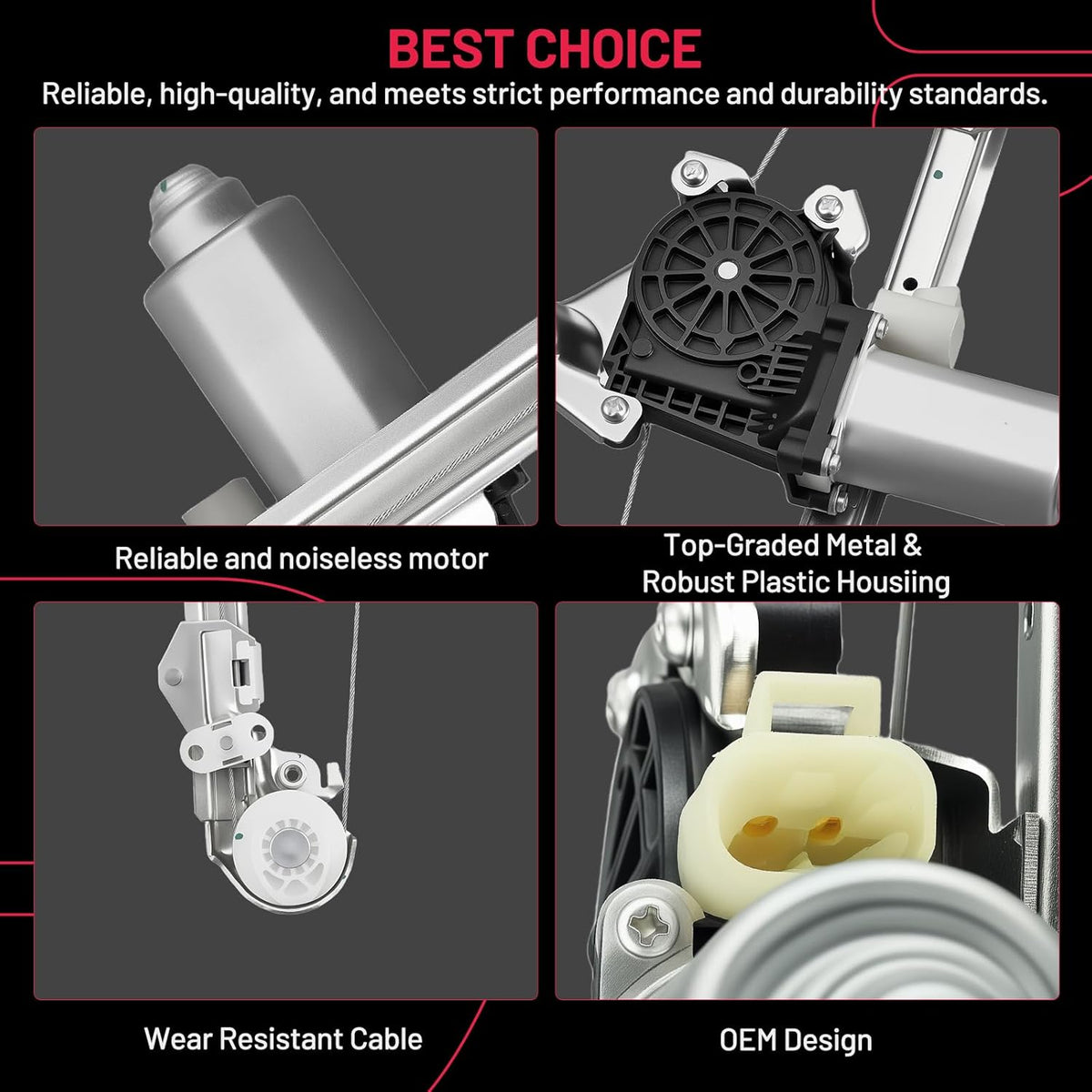 【Premium Quality】 This window regulator and motor assembly feature significant enhancements over the factory part, providing a higher level of reliability. It incorporates tension springs to effectively resist cable reel binding caused by prolonged use. Additionally, it is equipped with advanced cable guides to eliminate high cable tension and reduce cable stress.