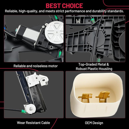 【Premium Quality】 This window regulator and motor assembly feature significant enhancements over the factory part, providing a higher level of reliability. It incorporates tension springs to effectively resist cable reel binding caused by prolonged use. Additionally, it is equipped with advanced cable guides to eliminate high cable tension and reduce cable stress.