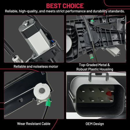 【Premium Quality】 This window regulator and motor assembly feature significant enhancements over the factory part, providing a higher level of reliability. It incorporates tension springs to effectively resist cable reel binding caused by prolonged use. Additionally, it is equipped with advanced cable guides to eliminate high cable tension and reduce cable stress.
