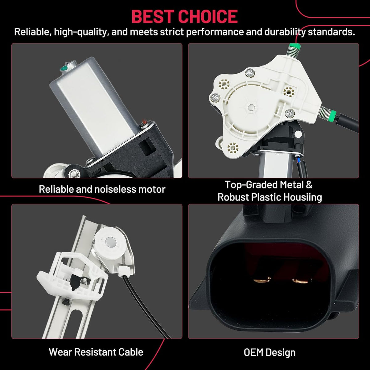 【Premium Quality】 This window regulator and motor assembly feature significant enhancements over the factory part, providing a higher level of reliability. It incorporates tension springs to effectively resist cable reel binding caused by prolonged use. Additionally, it is equipped with advanced cable guides to eliminate high cable tension and reduce cable stress.