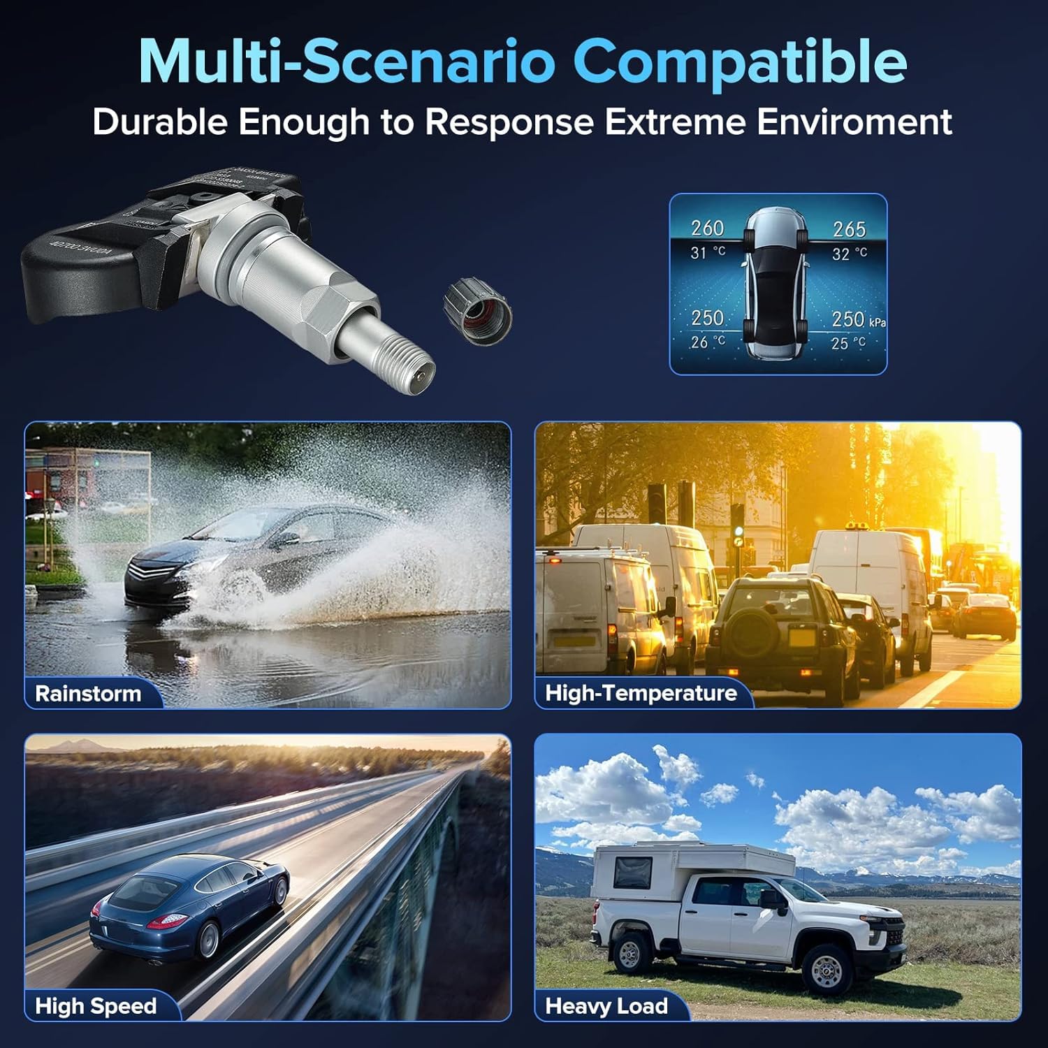 【High Performance & Reliability】: This Programmed TPMS Sensor is built with premium-grade components to ensure exceptional reliability, durability, and safety. Equipped with an automotive-grade battery providing a service life of over 3 years under normal use. Advanced chipset delivers strong signal stability and accurate real-time pressure readings. Engineered to withstand extreme temperatures from -49°F to 257°F, offering consistent performance even in harsh environments