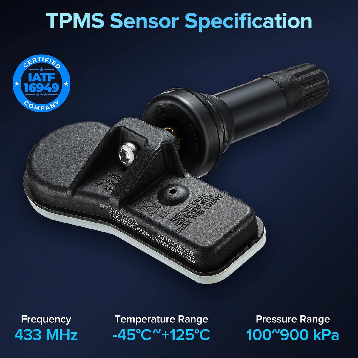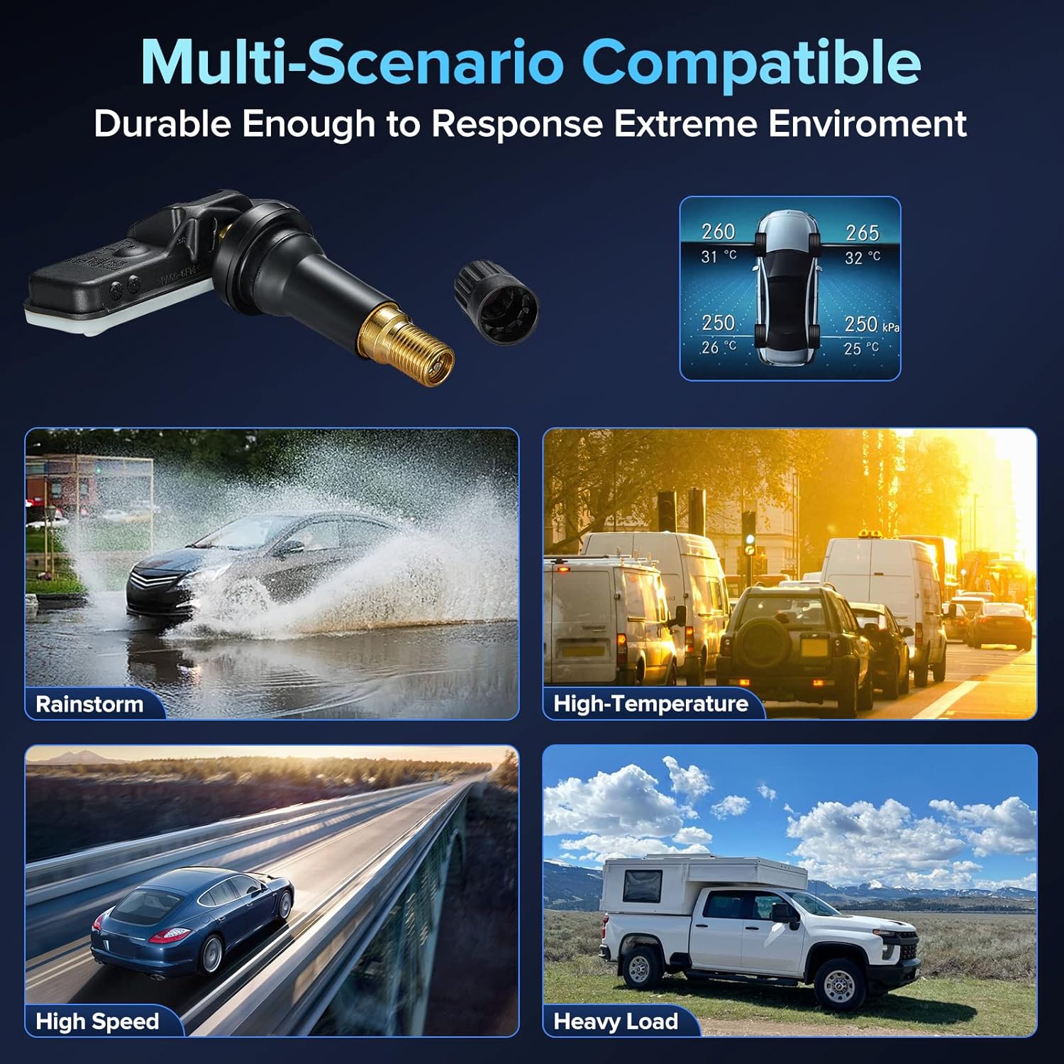 [ ]-This Tire Pressure Monitoring sensor is made from quality components to ensure the reliability, durabilitiy and safety of TPMS. Automotive-grade battery for long service life for over 3 years of normal use, Cutting-edge technology chip best signal strength real-time reading. High temperature resistance (257°F) and low temperature (-49°F) ensure the safety of your car even under harsh conditions.