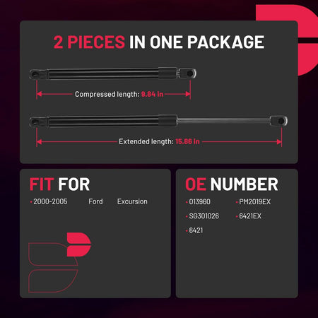 【Compatible with Excursion】 lift supports are compatible with Excursion 2000-2005. It has 2 items in one set and installs at front hood. Please check year and model at detail page before purchasing.