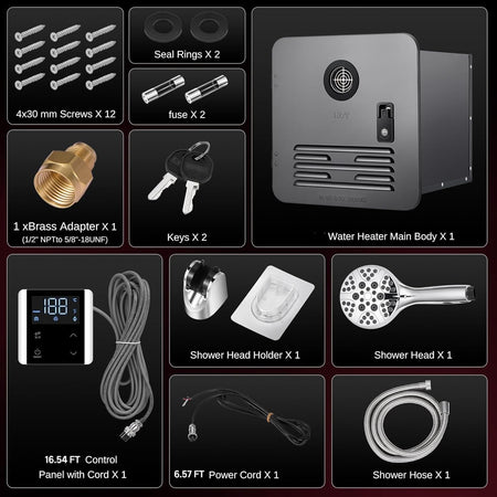 Packing List: water heater * 1, controller * 1, power cord * 1, door keys * 2, shower set * 1 (shower * 1, hose * 1, self-adhesive shower bracket * 1), sealing ring * 2, 4 * 30mm door frame fixing screws * 12, fuse * 2, brass adapter (1/2" NPT 1 to 5/8"-18UNF) * 1, neutral instruction manual * 1
