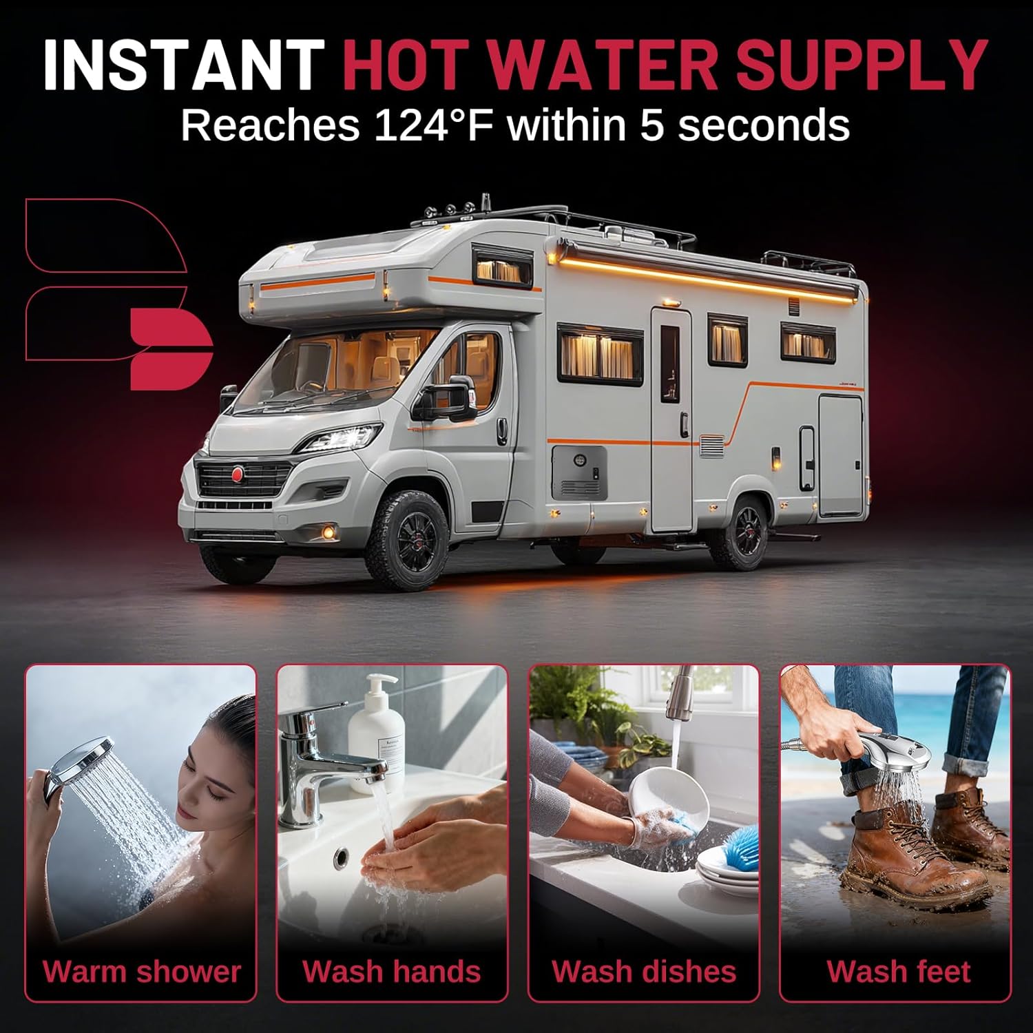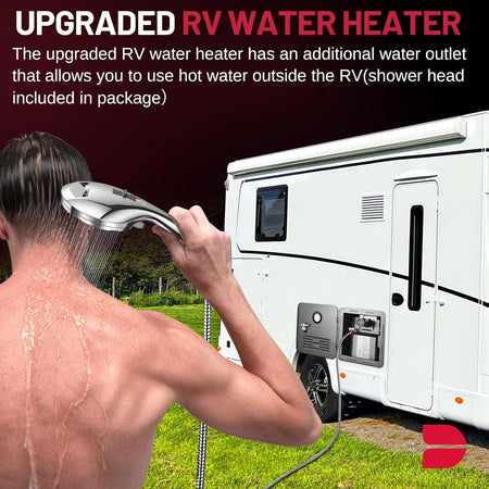 Dual Water Outlets: The RV tankless water heater is designed with dual water outlets inside and outside to meet daily RV needs and outdoor needs. An external shower hose connects to the outside of your RV to easily rinse muddy feet or bathe your pets, keeping your RV clean while enjoying nature