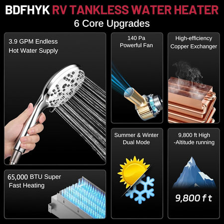 High altitude Application: The BDFHYK RV on-demand Water Heater can operate at above 9800 ft high altitudes. an oxygen-free copper heat exchanger, and a brushless DC fan, It accommodates the low-oxygen conditions experienced at such elevations