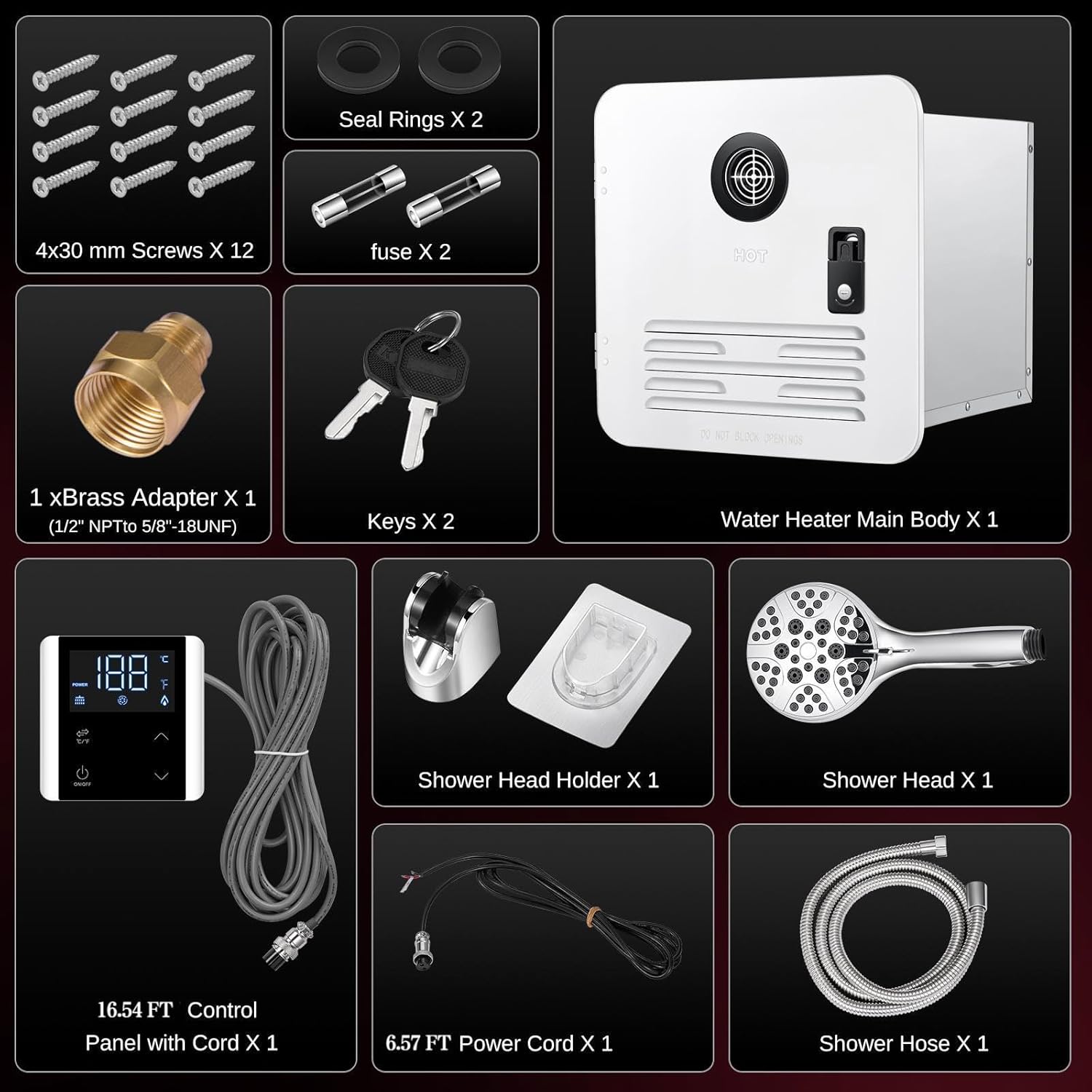 Packing List: water heater * 1, controller * 1, power cord * 1, door keys * 2, shower set * 1 (shower * 1, hose * 1, self-adhesive shower bracket * 1), sealing ring * 2, 4 * 30mm door frame fixing screws * 12, fuse * 2, brass adapter (1/2" NPT 1 to 5/8"-18UNF) * 1, neutral instruction manual * 1