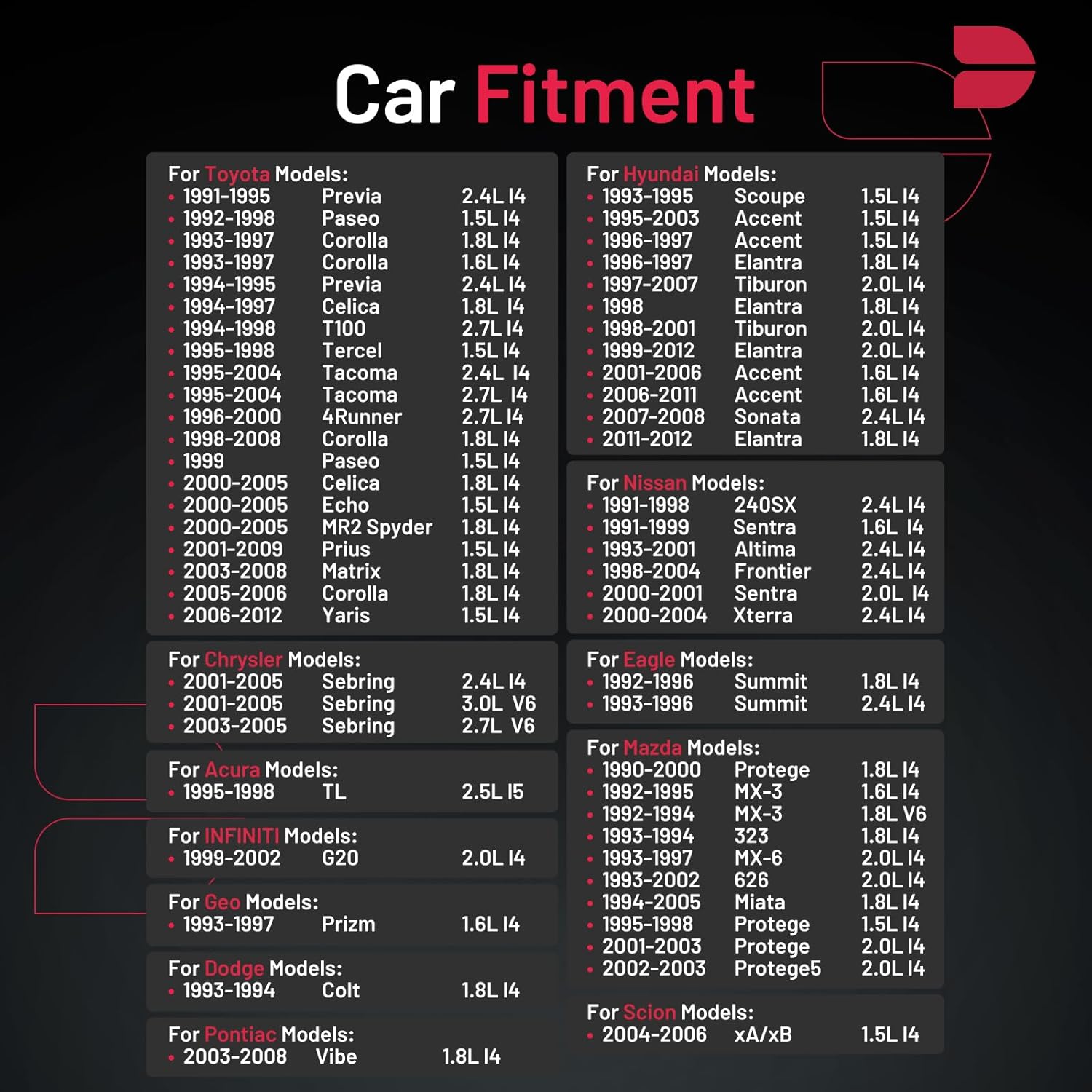 【Precautions for Purchase】:Compatible with Acura; Compatible with Chevrolet; Compatible with Chrysler; Compatible with Dodge; Compatible with Eagle; Compatible with Geo; Compatible with Hyundai; Compatible with INFINITI; Compatible with Mazda; Compatible with Nissan; Compatible with Pontiac; Compatible with Scion; Compatible with Toyota.Please confirm the compatibility according to the year/make/model of your vehicle and the OE number of the replaceable part.
