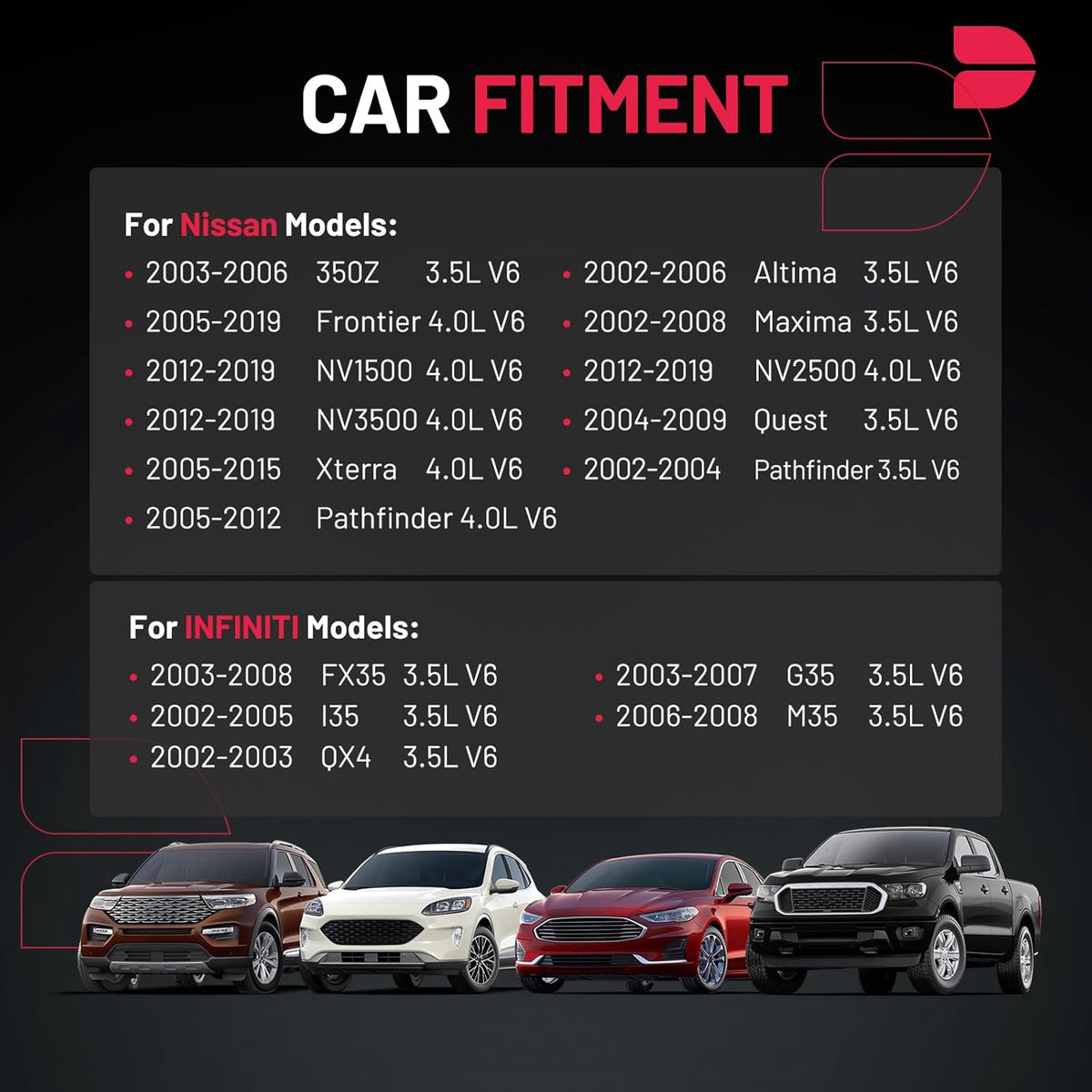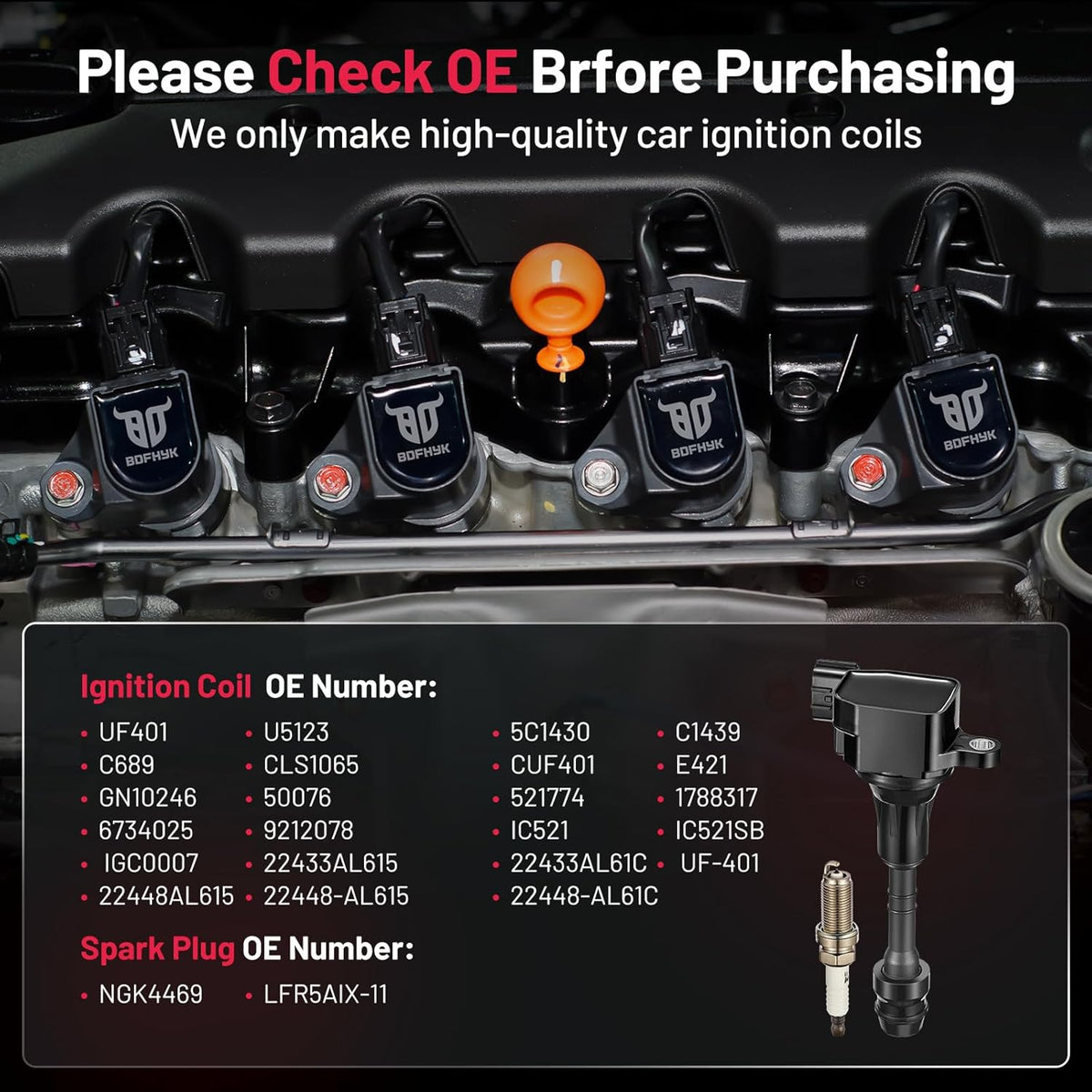 【Basic Info:】Ignition Coil UF401 & Spark Plug NGK4469 Compatible with INFINITI G35 I35 M35 QX4, Compatible with Nissan 350Z Altima Frontier Maxima NV1500 NV2500 NV3500 Pathfinder Quest Xterra. Please check detail fitting info from pics or detail page. OE checking is necessary before buying. 12 months warranty and lifetime after-sales service are furnished after buying our products. Please choose a suitable one with confidence.