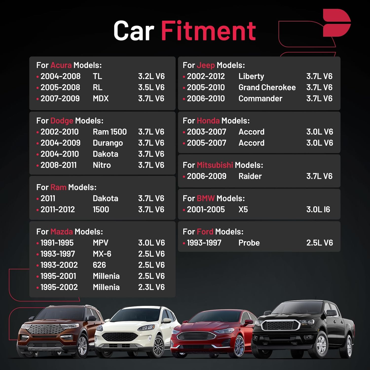 【Precautions for Purchase】:Compatible with Acura 2007-2009 MDX RL TL,2001-2005 X5,2008-2011 Nitro Dakota Ram 1500 Durango,1993-1997 Probe,2003-2007 Accord,2002-2012 Liberty Commander Grand Cherokee,1993-2002 626 Millenia MX-6 MPV,2006-2009 Raider,2011 Ram Dakota.Please confirm the compatibility according to the year/make/model of your vehicle and the OE number of the replaceable part.