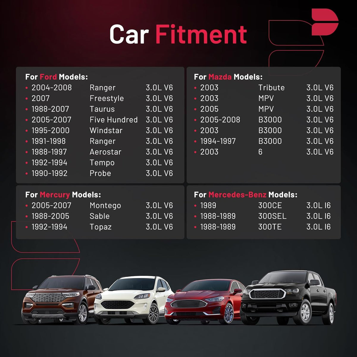 【Compatibility Information】:Spark Plug SP413 compatible with Ranger Freestyle Taurus Five Hundred Windstar Aerostar Tempo Probe, compatible with Mazda 6 Tribute MPV B3000, compatible with Mercedes-Benz 300CE 300SEL 300TE, compatible with Mercury Montego Sable Topaz.Please see images or details page for complete Compatibility information