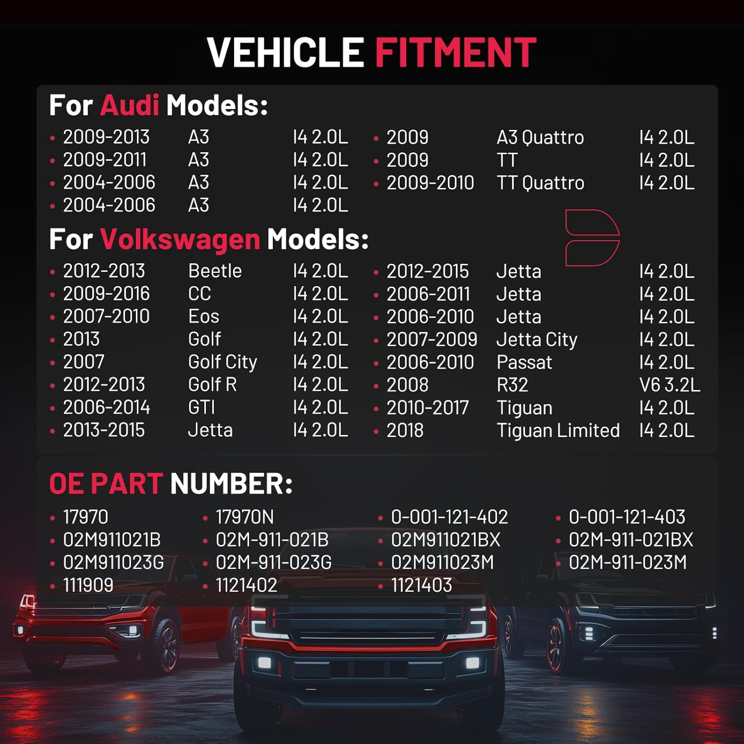 【Vehicle Fitment】 Compatible with Audi A3 04-06 09-13, A3 Quattro/TT 2009, TT Quattro 09-10, L4 2.0L. Compatible with Volkswagen Beetle 12-13, CC 09-16, Eos 07-10, Golf 2013, GolfR 12-13, GTI 06-14, Jetta 06-15, Passat 06-10, R32 2008, L4 2.0L 3.2L
