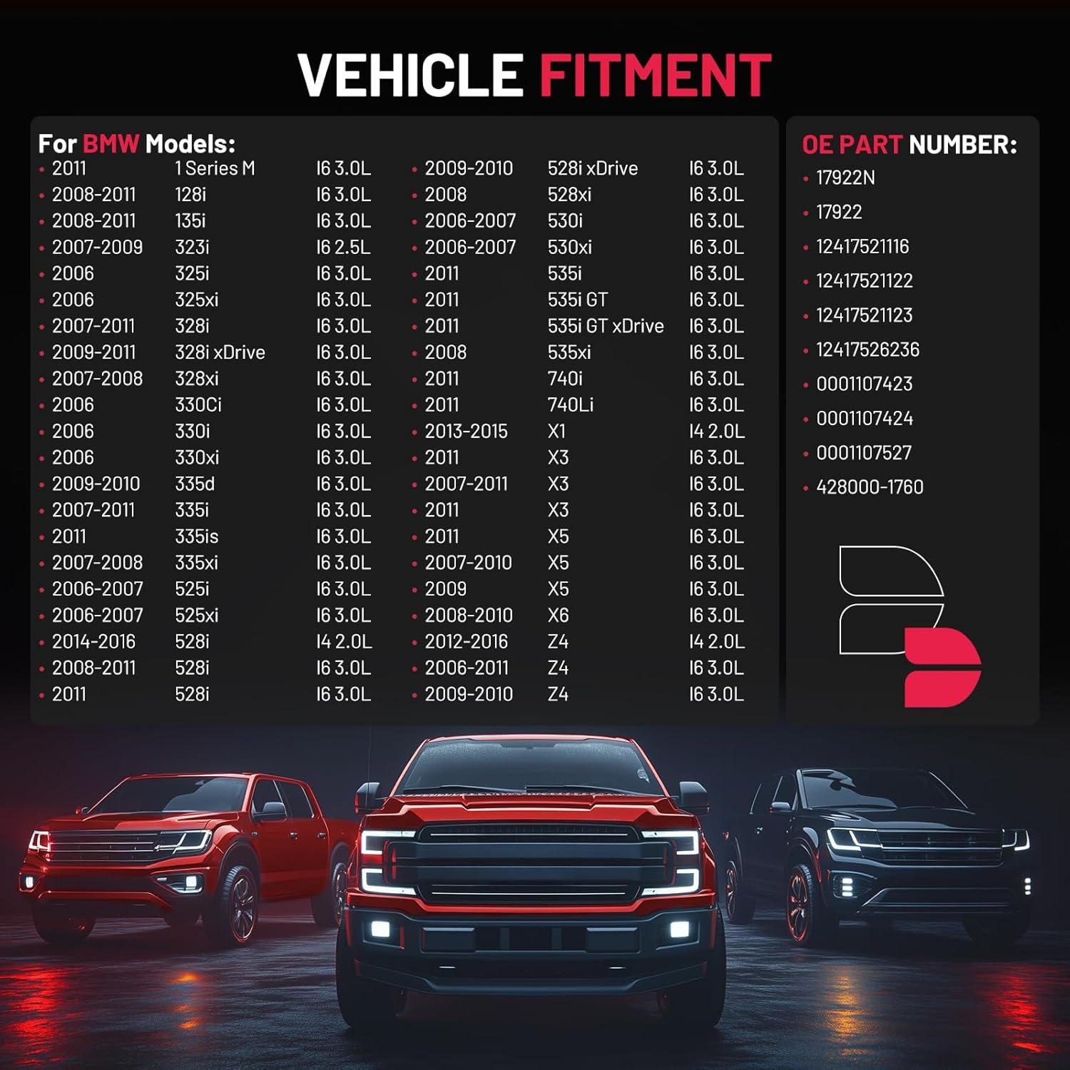 【Vehicle Fitment】 Compatible with BMW 330i 06, 328i 07-11, 323i 07-09, 325i/325xi 06, 328i 07-11, 328xi 07-08, 330Ci/330i/330xi 2006, 335i 07-11, 528i 08-16, X1 13-15, X3 07-11, X5 07-11, X6 08-10, Z4 06-16, L6 3.0L 2.5L