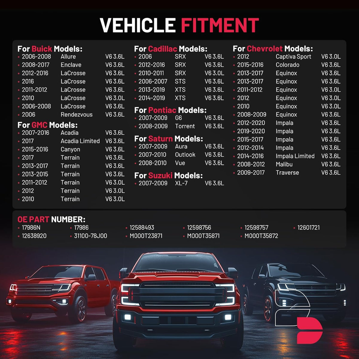 【Vehicle Fitment】 Compatible with Buick Allure 2006-2008, Enclave 2008-2017, V6 3.0L 3.6L. Compatible with Cadillac SRX 2010-2016, STS 2006-2007, XTS 2013-2019, V6 3.0L 3.6L. Compatible with Chevrolet Equinox 2008-2017, Impala 2012-2020, Malibu 2008-2012, Traverse 2009-2017, V6 3.0L 3.6L. Compatible with GMC Acadia 2007-2016, Canyon 2015-2016, Terrain 2011-2017, V6 3.0L 3.6L.