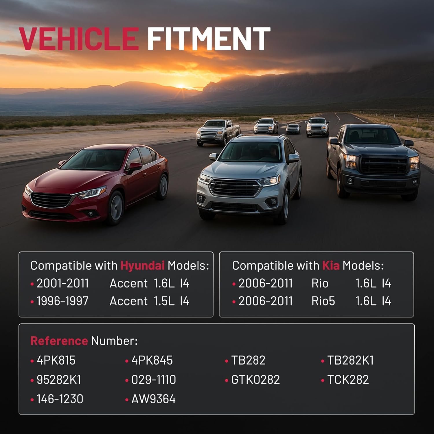 [Fitment]: Timing Belt Kit Compatible with Hyundai 1996–1997 Accent 1.5L L4, 2001–2011 Accent 1.6L L4; Compatible with Kia 2006–2011 Rio Rio5 1.6L L4.