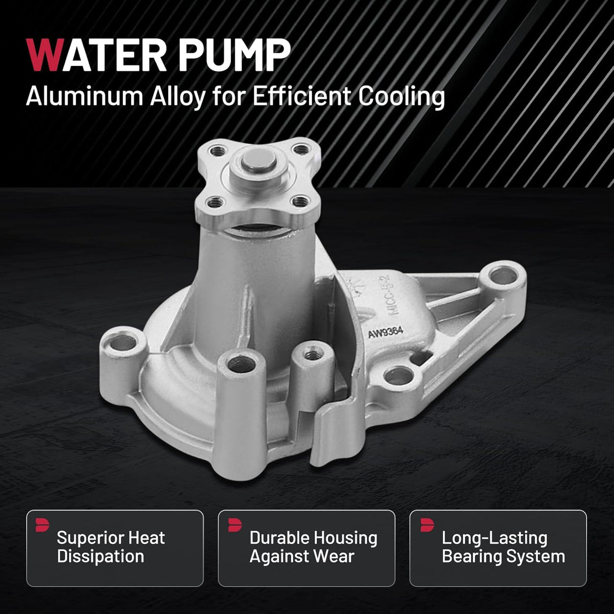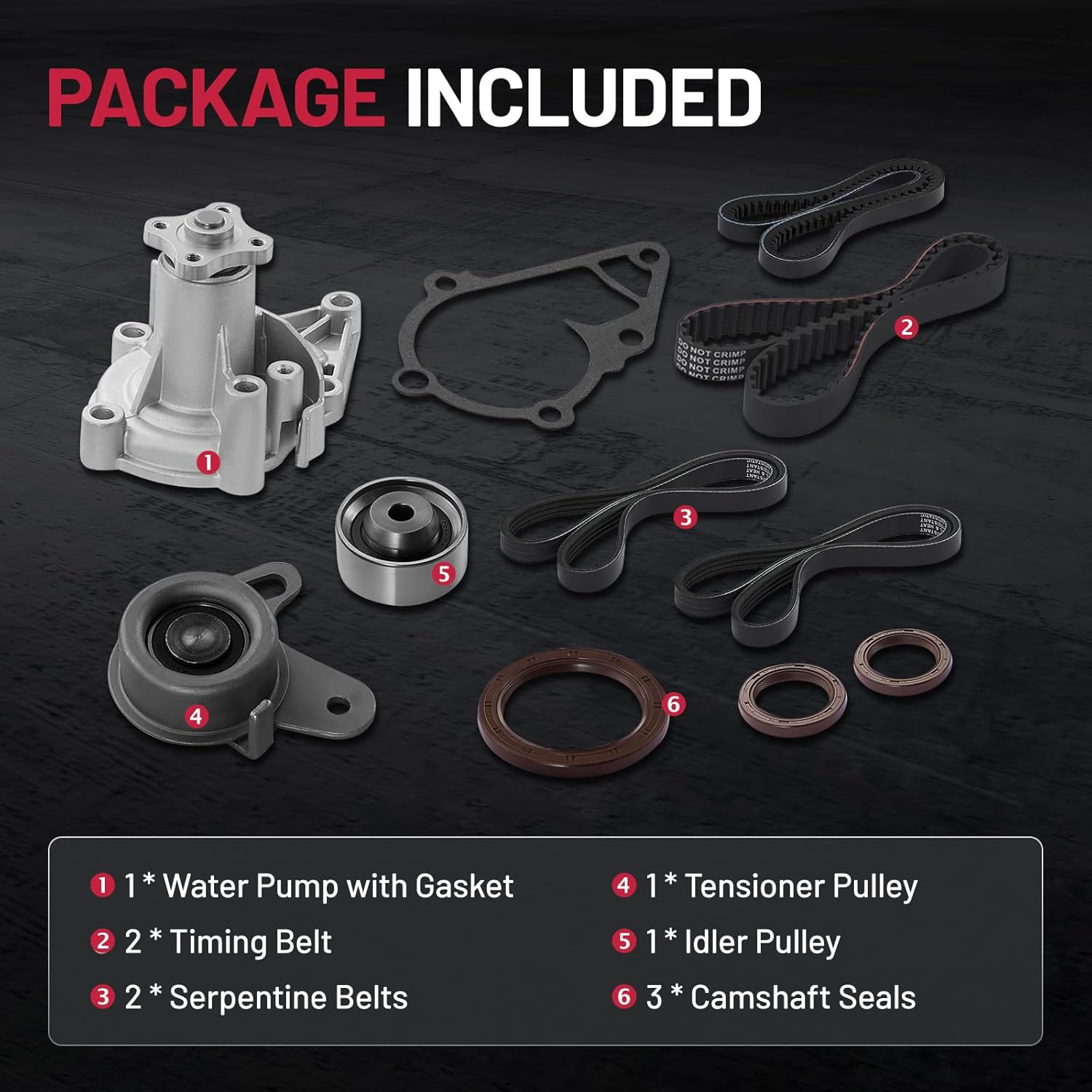 [PACKAGE INCLUDES]: 1 x Water Pump with Gasket, 2 x Timing Belts, 2 x Serpentine Belts, 1 x Timing Belt Tensioner Pulley, 1 x Timing Belt Idler Pulley, 3 x Camshaft Seals