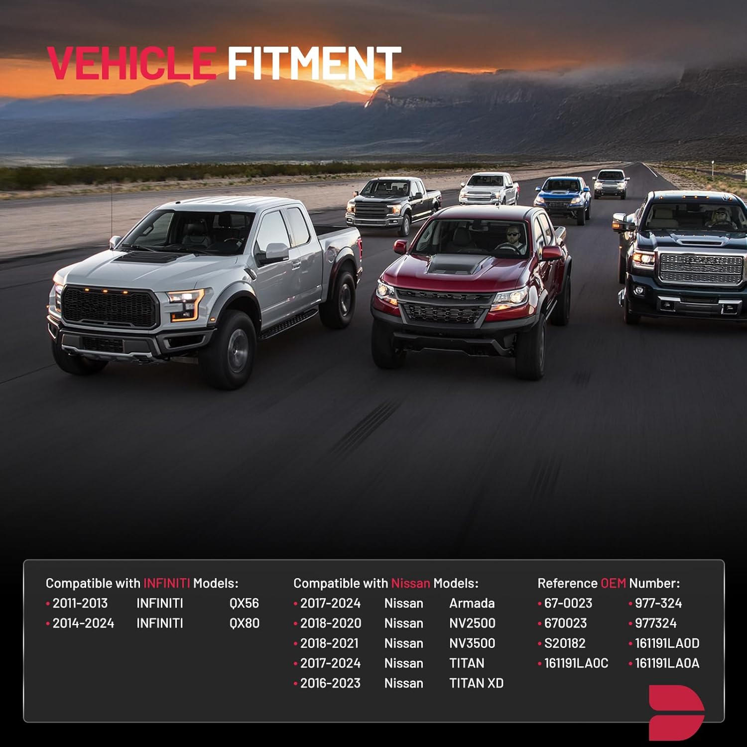 【Compatibility】Compatible with 2011-2013 INFINITI QX56, 2014-2024 INFINITI QX80, 2017-2024 Nissan Armada, 2018-2020 Nissan NV2500, 2018-2021 Nissan NV3500, 2017-2024 Nissan TITAN, 2016-2023 Nissan TITAN XD.