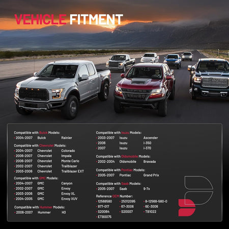 【Compatibility】Compatible with Buick Rainier 2004-2007, Compatible with Chevy Colorado 2004-2007, 2006-2007 Impala, 2006-2007 Monte Carlo, 2002-2007 Trailblazer, 2003-2006 Trailblazer EXT, Compatible with GMC Canyon 2004-2007, 2002-2007 Envoy,2003-2006 Envoy XL, 2004-2005 Envoy XUV, Compatible with Hummer H3 2006-2007, Compatible with Isuzu Ascender 2003-2007, Compatible with Isuzu i-350 2006, 2007 i-370, Compatible with Oldsmobile Bravada 2002-2004, Compatible with Pontiac Grand Prix 2005-2007, Compatible with Saab 9-7x 2005-2007