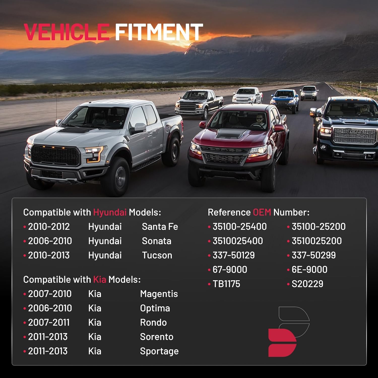 【Compatibility】Compatible with Hyundai Santa Fe 2010-2012 Sonata, 2006-2010 Tucson 2010-2013, Compatible with Kia Magentis 2007-2010, Optima 2006-2010, Rondo 2007-2011, Sorento 2011-2013, Sportage 2011-2013