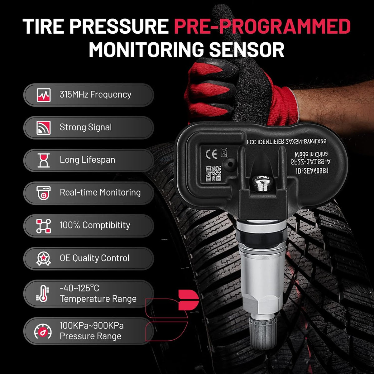 【 】- NO SENSOR PROGRAMMING REQUIRED! The tire pressure monitor system (TPMS) come pre-programmed specifically for your make/model/year of vehicle,just need activate them with scan tool