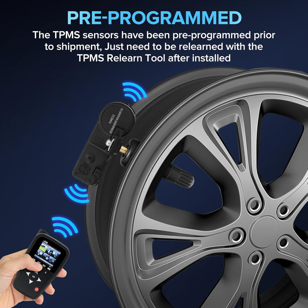 【 】- NO SENSOR PROGRAMMING REQUIRED! The tire pressure monitor system (TPMS) come pre-programmed specifically for your make/model/year of vehicle,just need activate them with scan tool