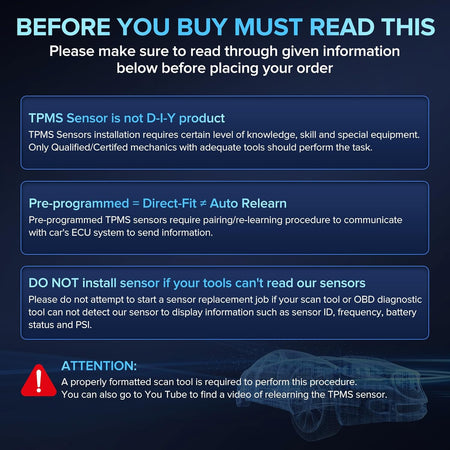【 】- NO SENSOR PROGRAMMING REQUIRED! The tire pressure monitor system (TPMS) come pre-programmed specifically for your make/model/year of vehicle,just need activate them with scan tool