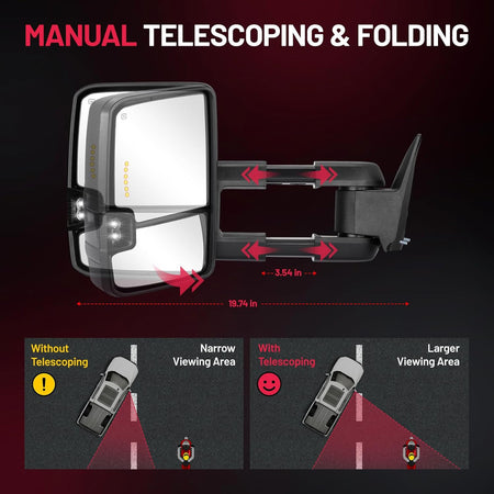 Extendable & Foldable for Versatility - Manually extend the mirrors outward for a wider rear view when towing, making maneuvering easier and improving safety. The foldable design protects the mirrors and simplifies parking in tight spaces. Perfect for large vehicles or towing heavy loads.