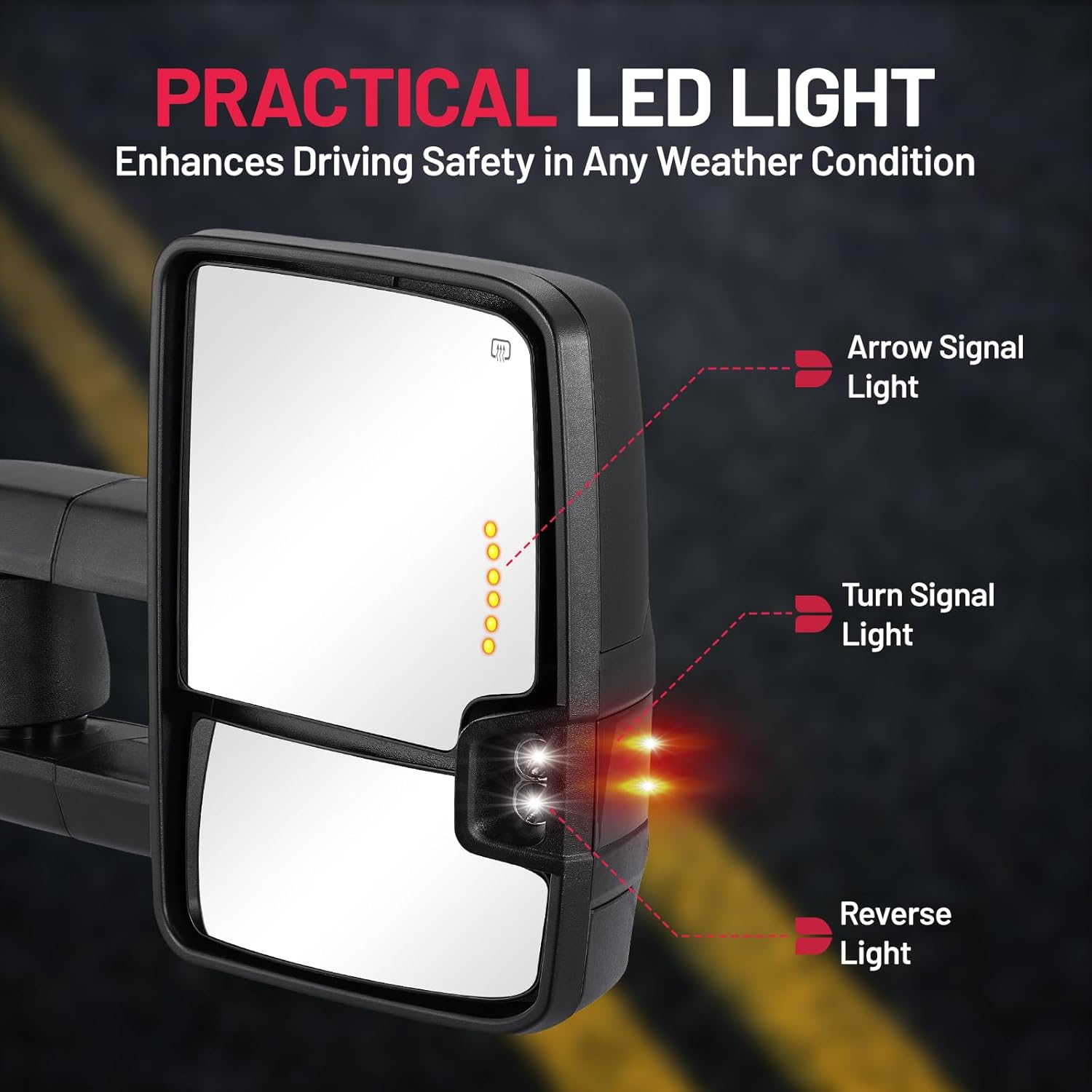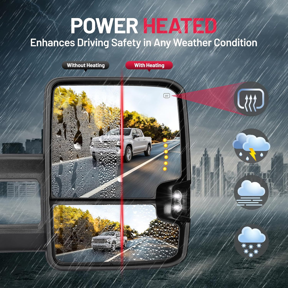 Stay Safe & Clear in Any Weather - Features built-in heating to prevent ice and frost buildup in cold weather and reduce fogging during rain or mist. Integrated turn signals and reverse lights boost visibility for you and surrounding drivers.