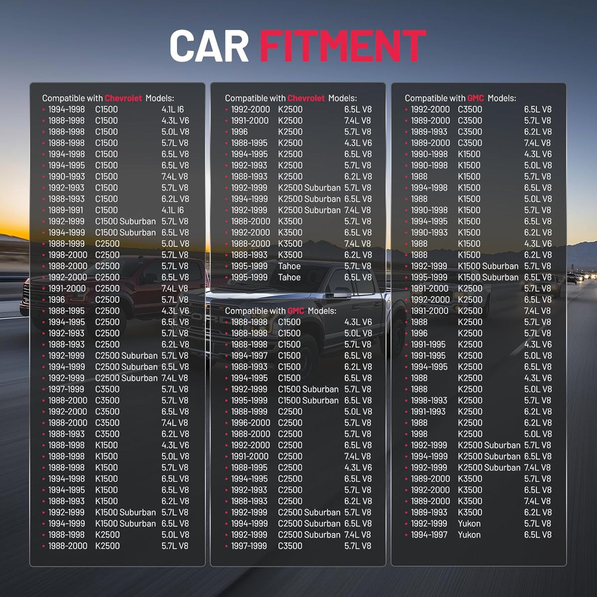 Vehicle Fitment - The towing mirrors compatible with Chevy C1500 K1500 1988-1998, C2500 K2500 K3500 1988-2000, C3500 1988-2001, 1995-1999 Tahoe, C1500/C2500/K1500/K2500 Suburban 1992-1999; compatible with GMC C1500 K1500, C2500 K2500 K3500, C3500, C/K 1500 2500 Suburban, Yukon.