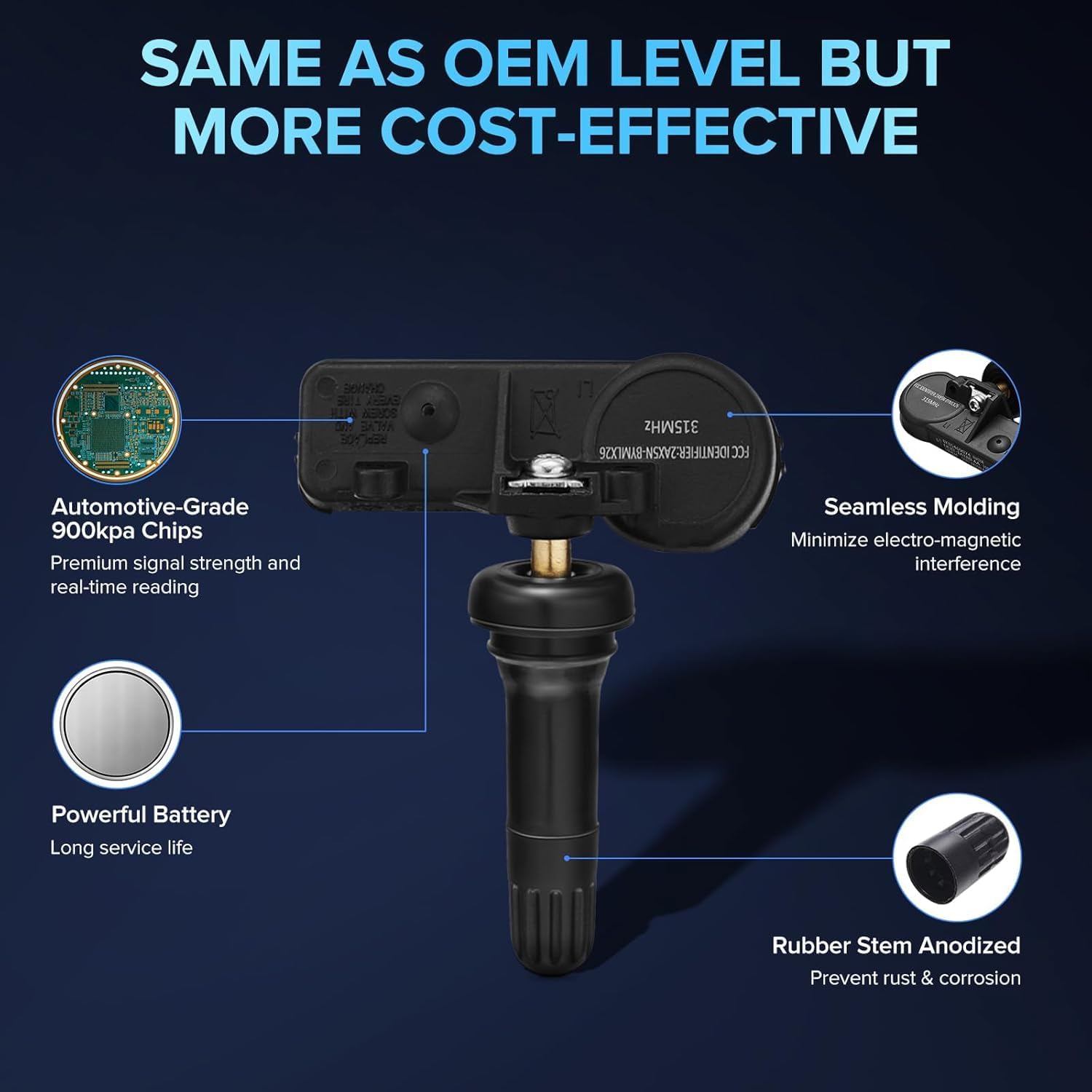 【High Performance & Reliability】: This Programmed TPMS Sensor is built with premium-grade components to ensure exceptional reliability, durability, and safety. Equipped with an automotive-grade battery providing a service life of over 3 years under normal use. Advanced chipset delivers strong signal stability and accurate real-time pressure readings. Engineered to withstand extreme temperatures from -49°F to 260°F, offering consistent performance even in harsh environments