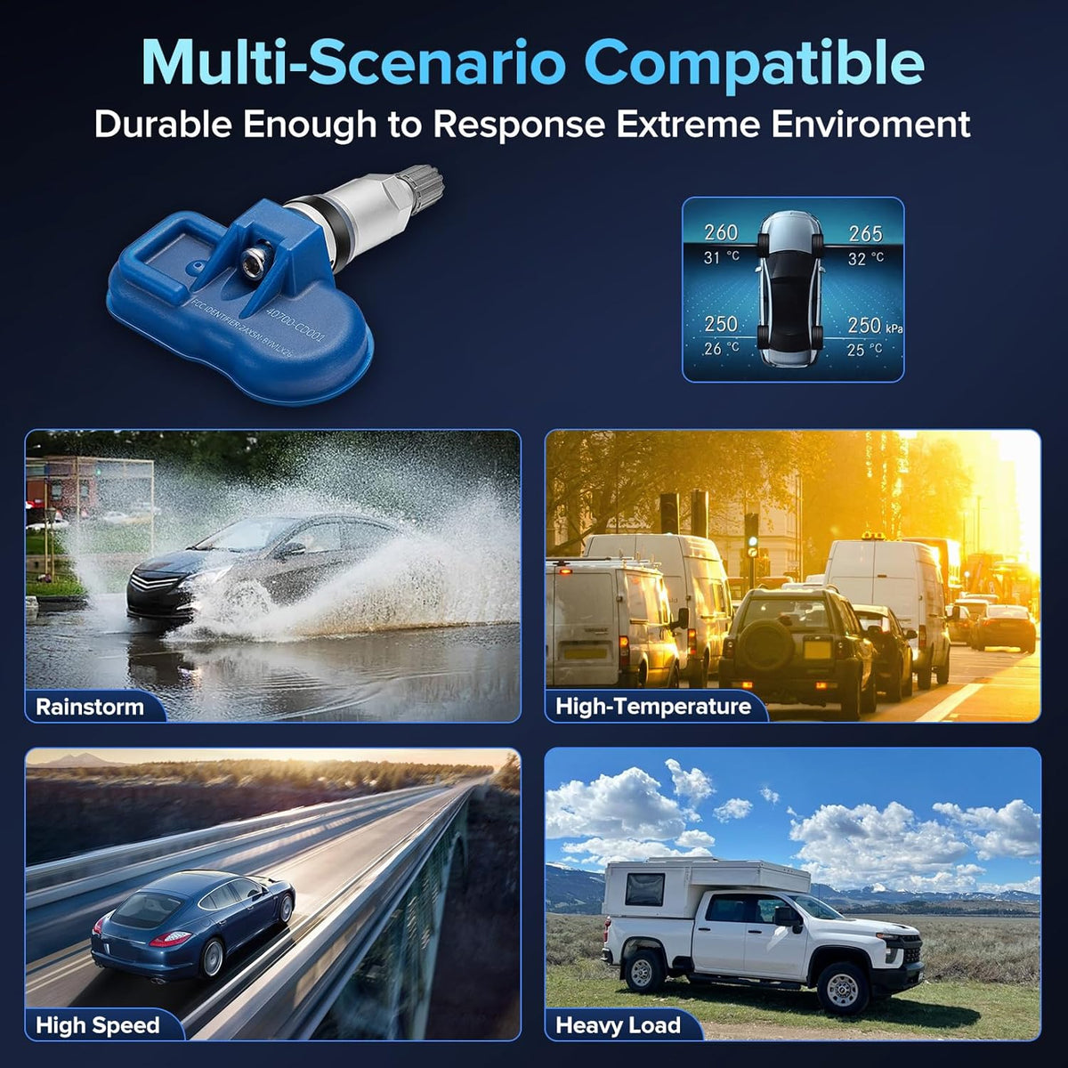 【SOLID & DURABLE】 This TPMS Sensor is equipped with an automotive-grade battery to meet severe weather conditions with long service life for over 3 years. High temperature resistance (257°F) and low temperature (-49°F) ensure the safety of your car even under harsh conditions.