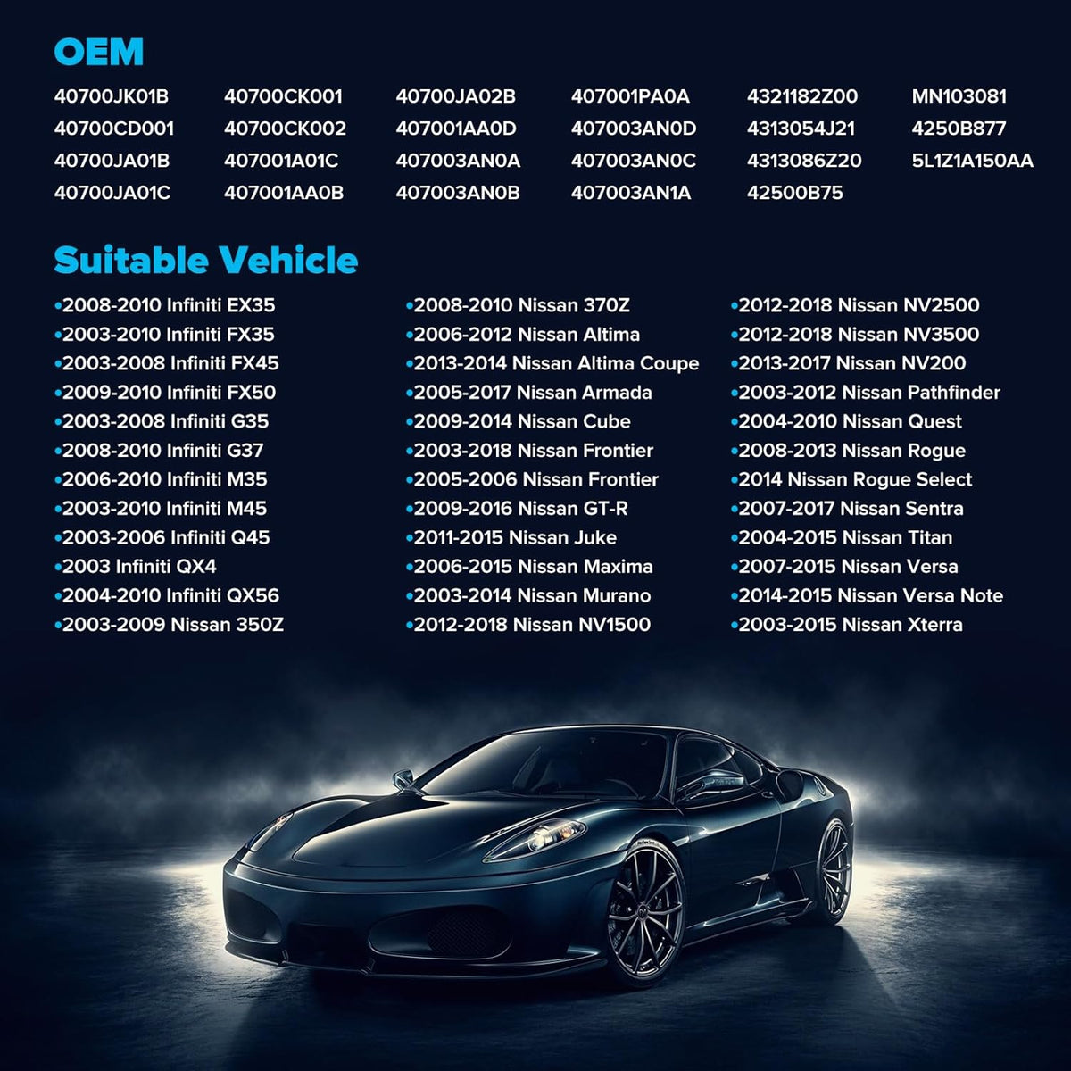 【Fitment】: Fits for Infiniti: EX35 FX35 FX45 FX50 G35 G37 M35 M45 Q45 QX4 QX56, Nissan: 350Z 370Z Altima Armada Cube Frontier GT-R Juke Maxima Murano NV1500 NV2500 NV3500 NV200 Pathfinder Quest Rogue Rogue Select Sentra Titan Versa Versa Note Xterra. OE# 426070C070 426070C050 4260708010 426070C060 426070C080 426070D010