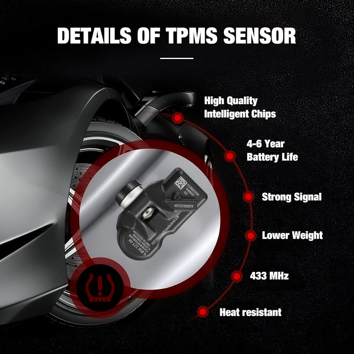 [ ]-This Tire Pressure Monitoring sensor is made from quality components to ensure the reliability, durabilitiy and safety of TPMS. Automotive-grade battery for long service life for over 3 years of normal use, Cutting-edge technology chip best signal strength real-time reading. High temperature resistance (257°F) and low temperature (-49°F) ensure the safety of your car even under harsh conditions.