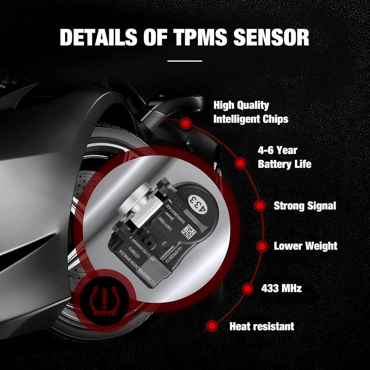 [ ]-This Tire Pressure Monitoring sensor is made from quality components to ensure the reliability, durabilitiy and safety of TPMS. Automotive-grade battery for long service life for over 3 years of normal use, Cutting-edge technology chip best signal strength real-time reading. High temperature resistance (257°F) and low temperature (-49°F) ensure the safety of your car even under harsh conditions.