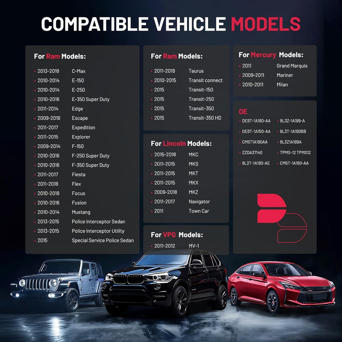 Replace Part Numbers: DE8T-1A180-AA, DE8T-1A150-AA, 9L3Z-1A189-A, 9L3T-1A180-AE, 9L3T-1A180-AF, 9L3T-1A180-BB, 9L3T-1A180-CA, 9L3T-1A150-BE, CM5T-1A150-AA, CM5T-1A180-AA. The package includes 4 tire sensors, it is exactly OEM design to replace your defective sensor, perfect fit for your vehicle.