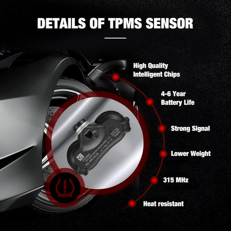 [ ]-This Tire Pressure Monitoring sensor is made from quality components to ensure the reliability, durabilitiy and safety of TPMS. Automotive-grade battery for long service life for over 3 years of normal use, Cutting-edge technology chip best signal strength real-time reading. High temperature resistance (257°F) and low temperature (-49°F) ensure the safety of your car even under harsh conditions.