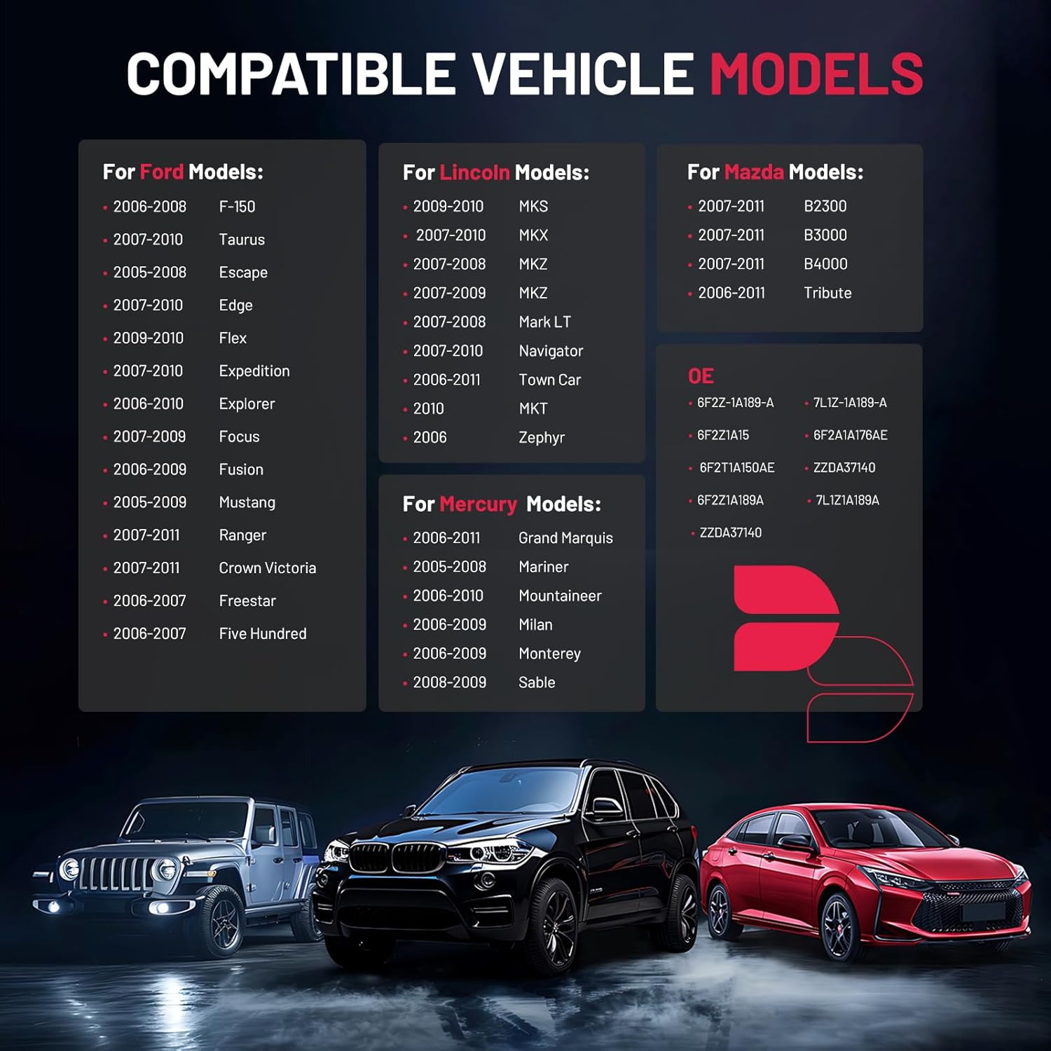 Fitment: Compatible with 2009-2010 Lincoln MKS, 2010 Lincoln MKT, 2007-2010 Lincoln MKX, 2007-2008 Lincoln MKZ, 2007-2009 Lincoln MKZ, 2007-2008 Lincoln Mark LT, 2007-2010 Lincoln Navigator, 2006-2011 Lincoln Town Car, 2006 Lincoln Zephyr, 2007-2011 Mazda B2300, 2007-2011 Mazda B3000, 2007-2011 Mazda B4000, 2006-2011 Mazda Tribute, 2006-2011 Mercury Grand Marquis, 2005-2008 Mercury Mariner, 2006-2010 Mercury Mountaineer, 2006-2009 Mercury Milan, 2006-2009 Monterey, 2008-2009 Sable