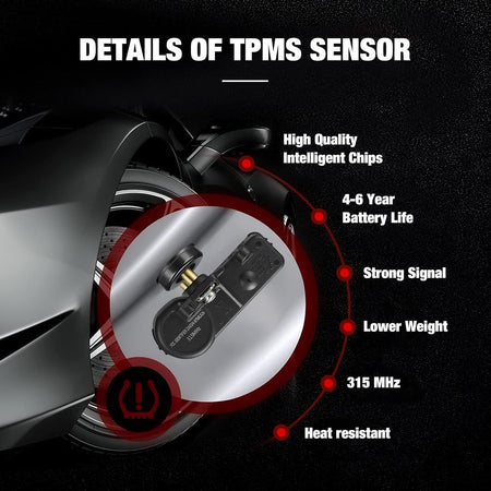 [ ]-This Tire Pressure Monitoring sensor is made from quality components to ensure the reliability, durabilitiy and safety of TPMS. Automotive-grade battery for long service life for over 3 years of normal use, Cutting-edge technology chip best signal strength real-time reading. High temperature resistance (257°F) and low temperature (-49°F) ensure the safety of your car even under harsh conditions.